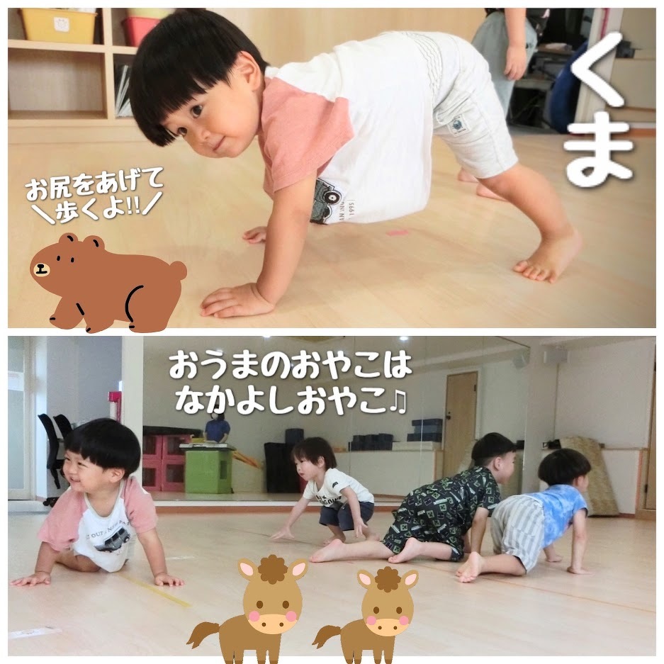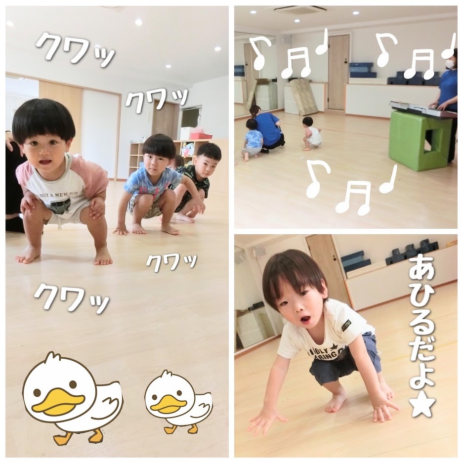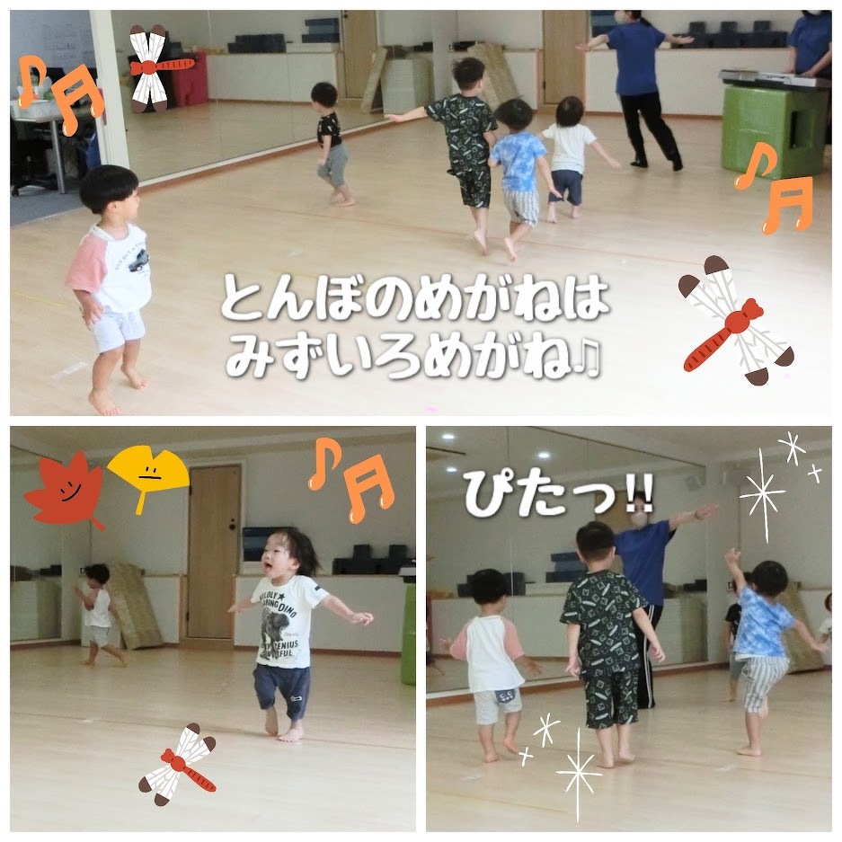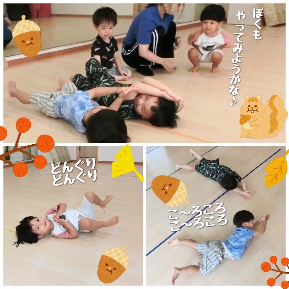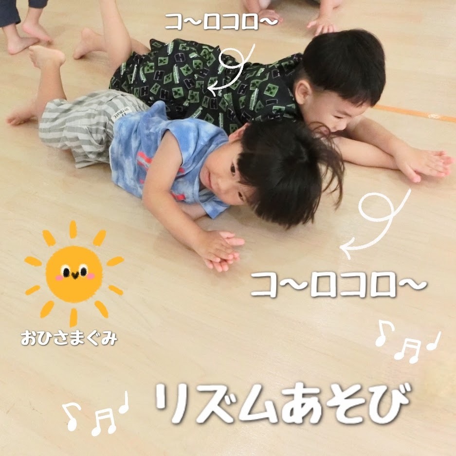 2023年09月12日(火) スタッフブログ おひさまぐみ/リズムあそび おひさまぐみで『リズムあそび』をした時の 様子をご紹介します(^o^) ピアノに合わせて、どんぐりやアヒル・とんぼ など様々なものになって遊びました♪ 床をコロコロ転がったり、しゃがんだまま前に 進んだり、手を広げてビューンと走ったり 先生の見本を見ながら楽しそうにマネをして いましたよ(^^)☆彡