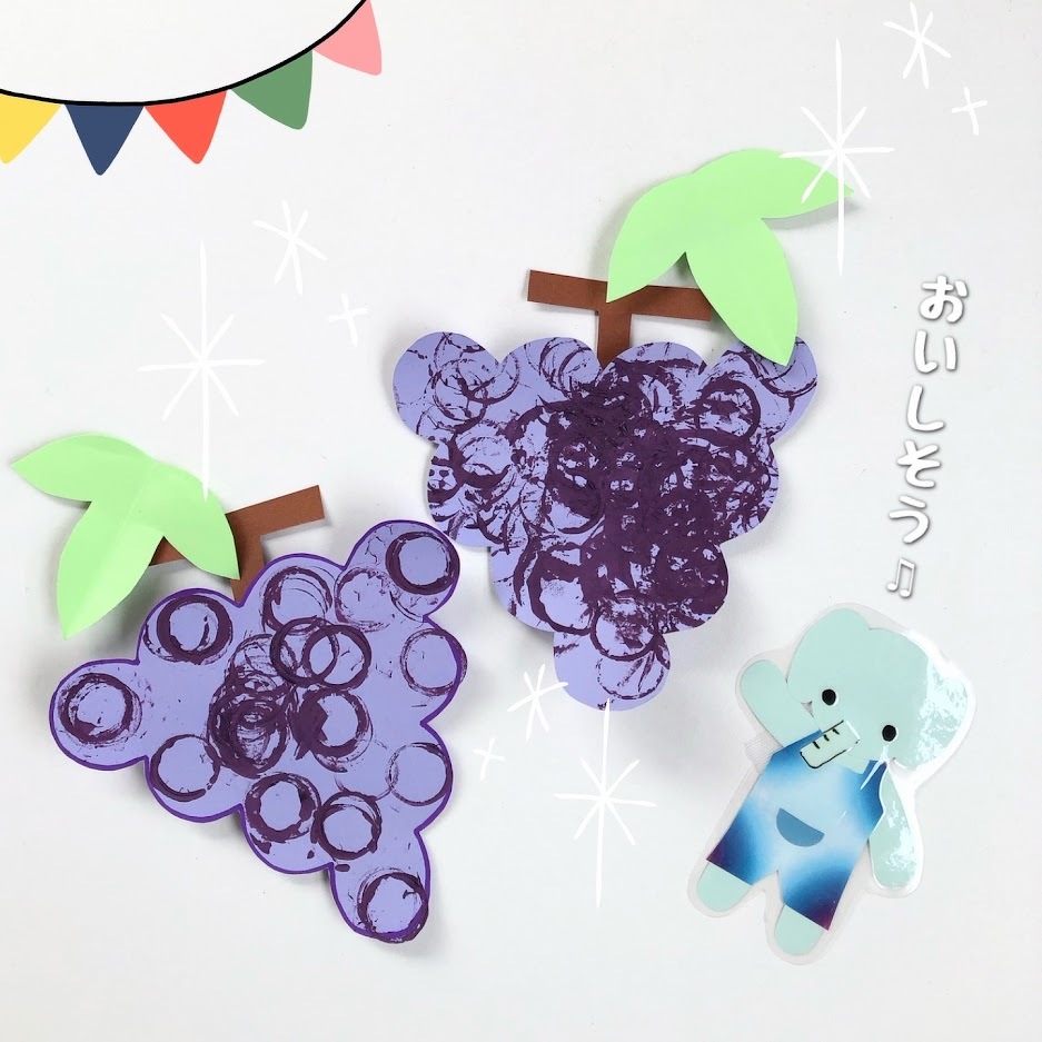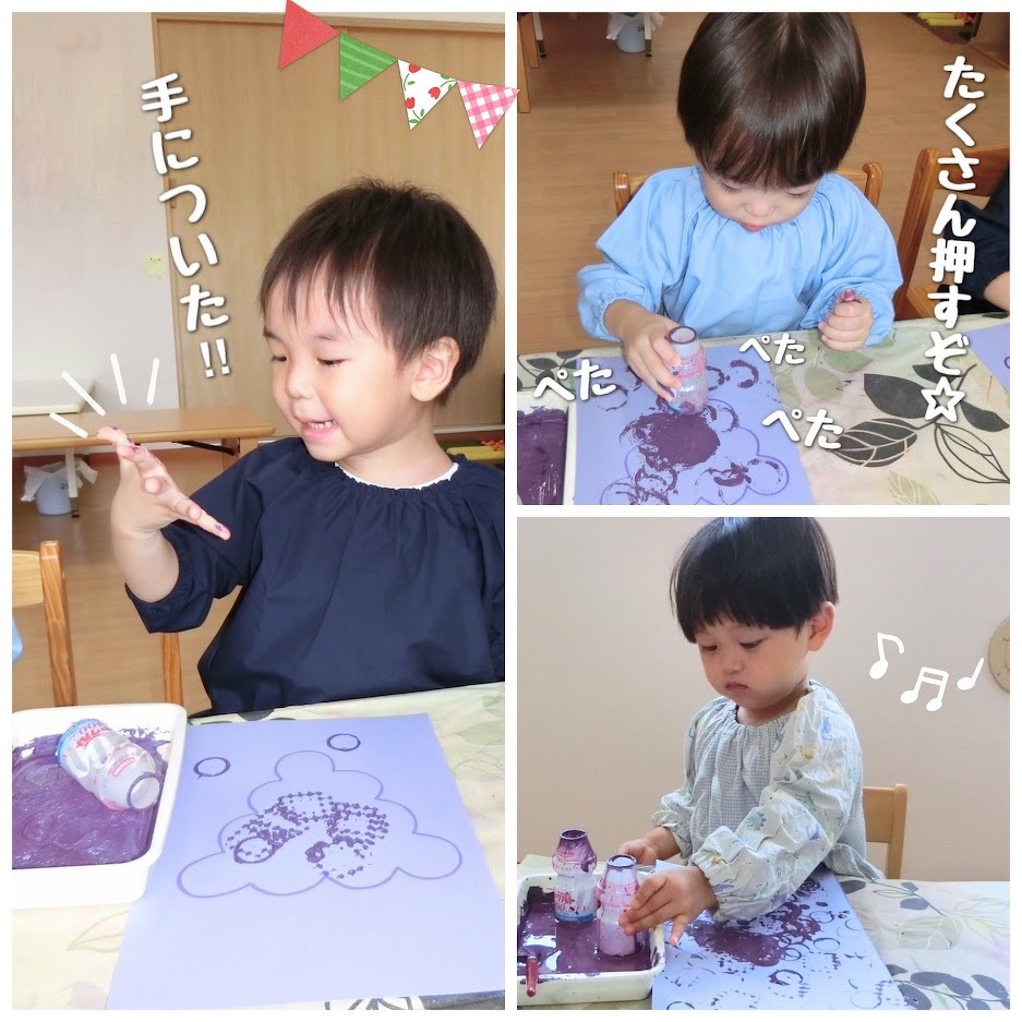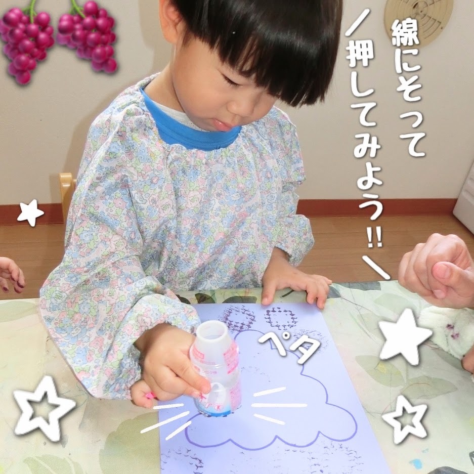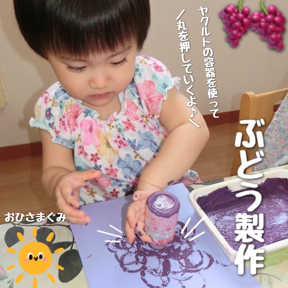 2023年09月20日(水) スタッフブログ おひさまぐみ/ぶどう製作 朝晩が涼しくなり、秋の訪れを感じることが 増えましたね(^o^) おひさまぐみでは秋の味覚『ぶどう』を 作りました♪ ヤクルトの容器に紫の絵の具を つけてペタペタ!ぺたぺた! 丸いぶどうの実を押していきます(^^) 甘くておいしいぶどうの完成☆彡