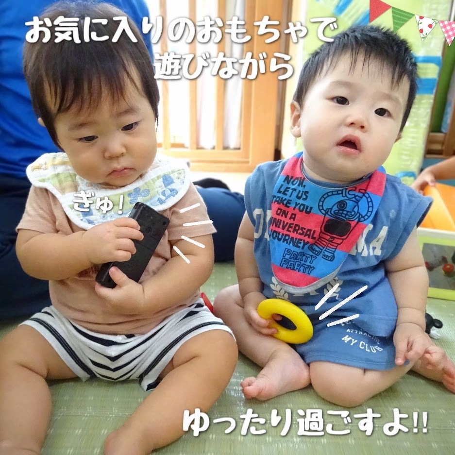 2023年09月22日(金) スタッフブログ にじぐみ/0歳児の過ごし方 今回はにじぐみの0歳児がどのように 過ごしているのかまとめてみました(^o^) 朝は1歳児と一緒に朝の会をして、 その後は自分の興味のあるおもちゃで 遊んだり、お友だちや先生と触れ合って 過ごしています☆ その他にも足型や手型をとって製作を したり、秋や春など気候が良い日には みんなで外へお散歩に行きますよ(^^) またご紹介したいと思います♫