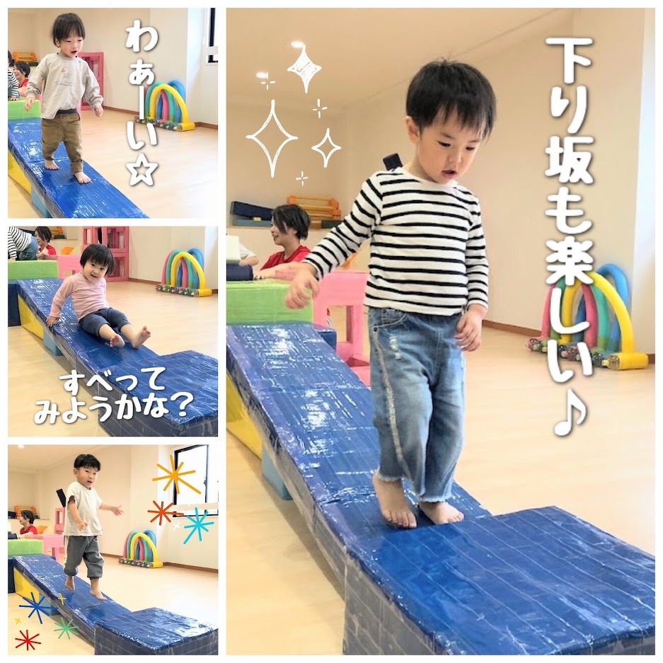 2023年11月08日(水) スタッフブログ おひさまぐみ/フィットネス おひさまぐみのフィットネスの様子です(^o^) この日はボールと手作り遊具を使って体を 動かしました♫ 子どもたちはボールが大好き!!先生から ボールを渡されるととても嬉しそう(^^) 先生が持っている輪っかめがけてボールを 何度も何度も投げていきます♪ 後半は手作り遊具☆彡 急な登り坂やゆるやかな下り坂など 子どもたちは積極的に楽しんでいました!