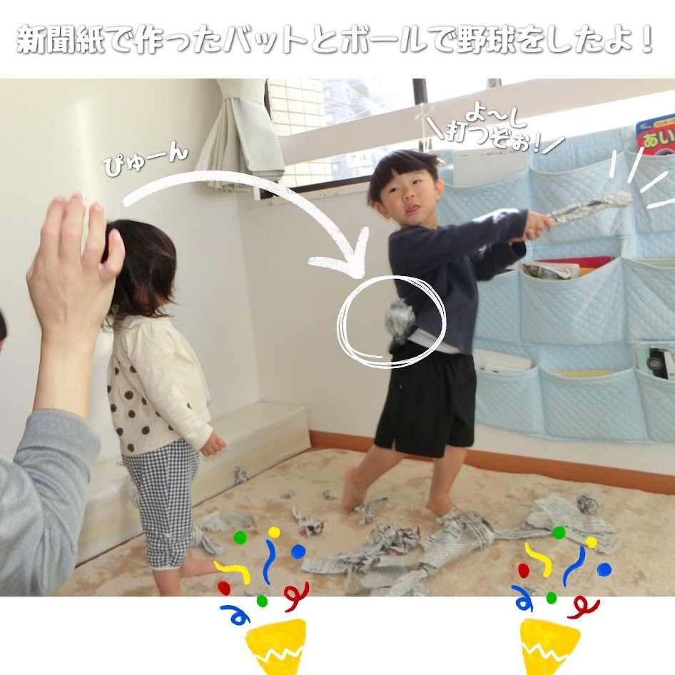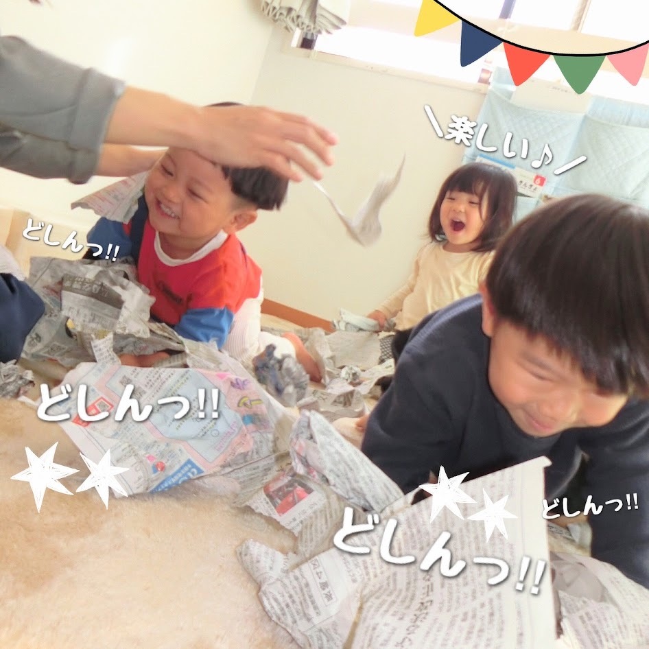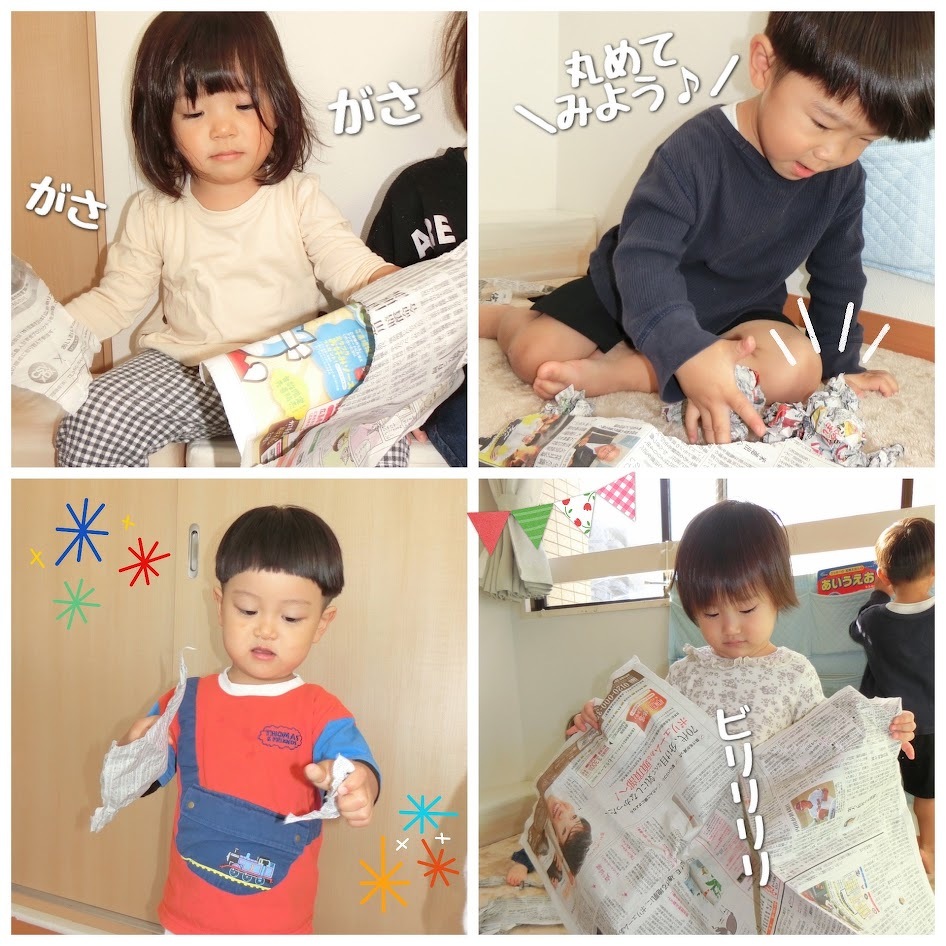 2023年11月14日(火) スタッフブログ おひさまぐみ/新聞あそび おひさまぐみのみんなで新聞あそびをした時の 様子をご紹介します(^o^) 新聞紙を 「びりびりびり~!!」とちぎったり 「ぎゅ!ぎゅ!」とまるめたり 落ちている新聞紙の上を「ガサガサガサ!」と 走ってみたり・・・(^^)☆彡 新聞紙で作ったバットとボールで野球を する子や、先生にはちまきを作ってもらって つけている子もいましたよ♫ 子どもたちは新聞あそび大好きですね!