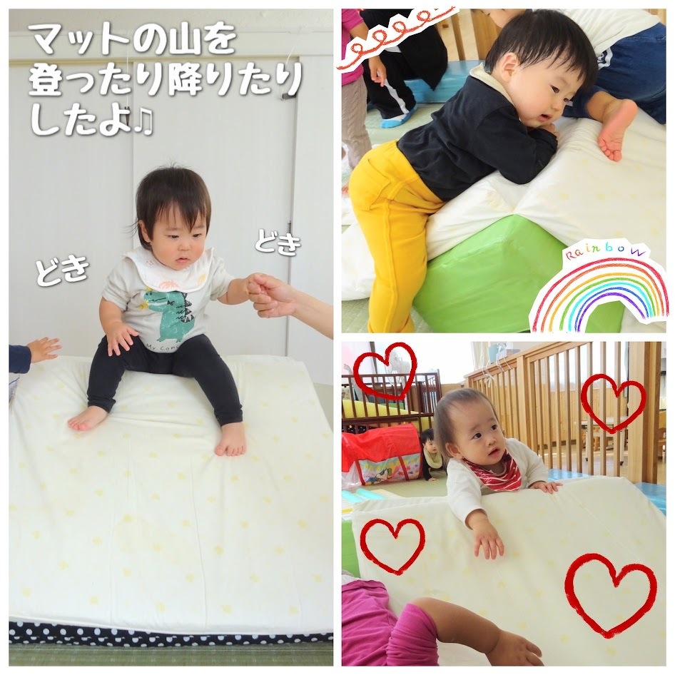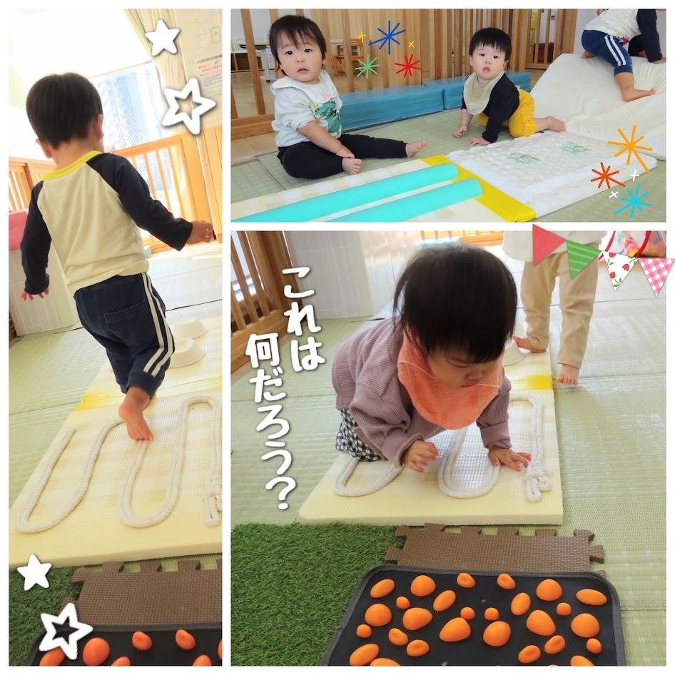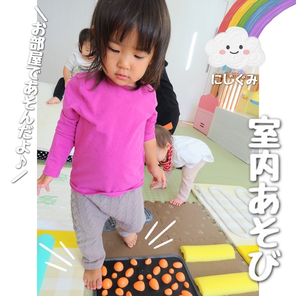2023年11月16日(木) スタッフブログ にじぐみ/室内あそび にじぐみで室内あそびをしている様子です(^o^) 様々なアイテムを並べて作った特製コースに みんなで挑戦しました!! 少しずつ違った種類の凸凹に苦戦しながらも、 楽しそうに歩く子どもたち(^^)♪ 赤いトンネルやマットで作った山も大人気で 何度もチャレンジしていましたよ☆彡