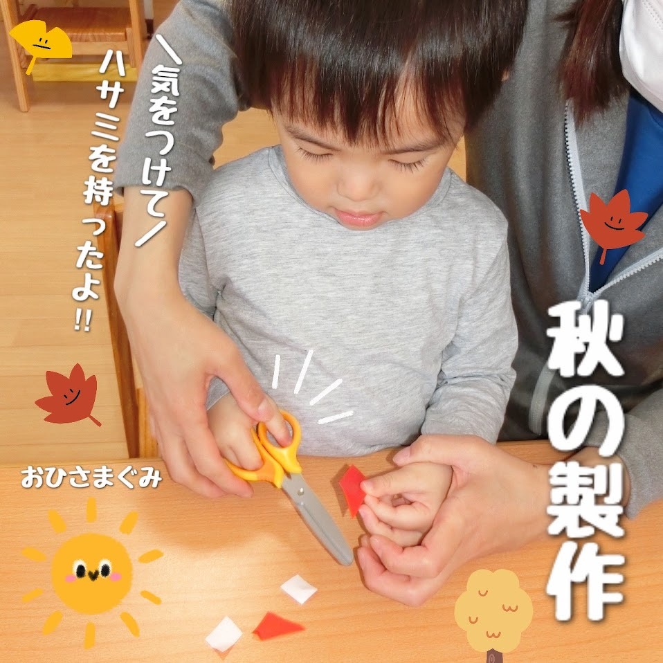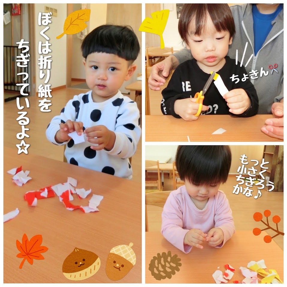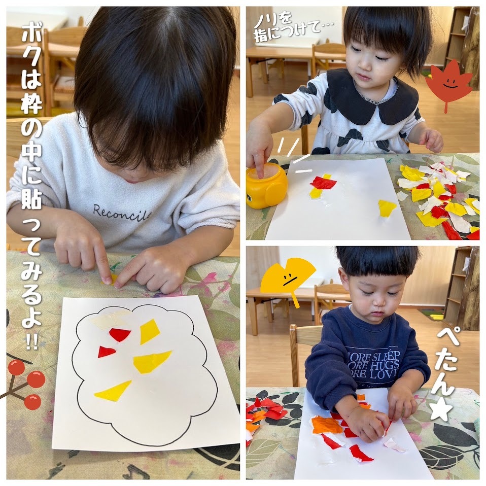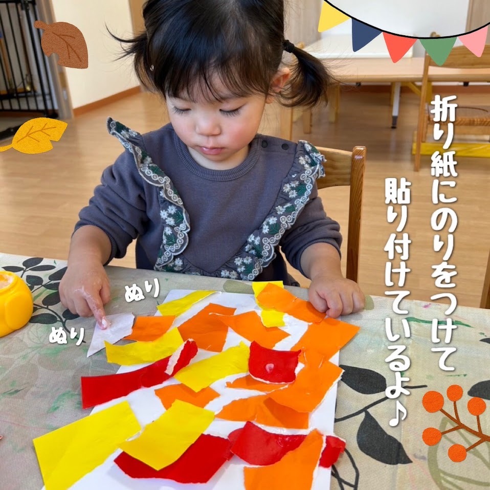 2023年11月29日(水) スタッフブログ おひさまぐみ/秋の製作 おひさまぐみでは折り紙を色づいた葉にみたて 紅葉した木を製作しました(^o^) 折り紙をハサミで切ったり、手でちぎったりと 月齢に合わせた方法で挑戦!!!! たくさんの葉ができました(^^)♪ 指でノリをすくい折り紙に塗りつけ、画用紙に ペタペタ♫ 画用紙には紅葉が広がり、とても綺麗でした! 近くの緑道もあっという間に秋に色づき始め、 寒い季節の訪れを感じます(>_<) 皆さん、体調には気をつけて過ごしていき ましょう☆彡