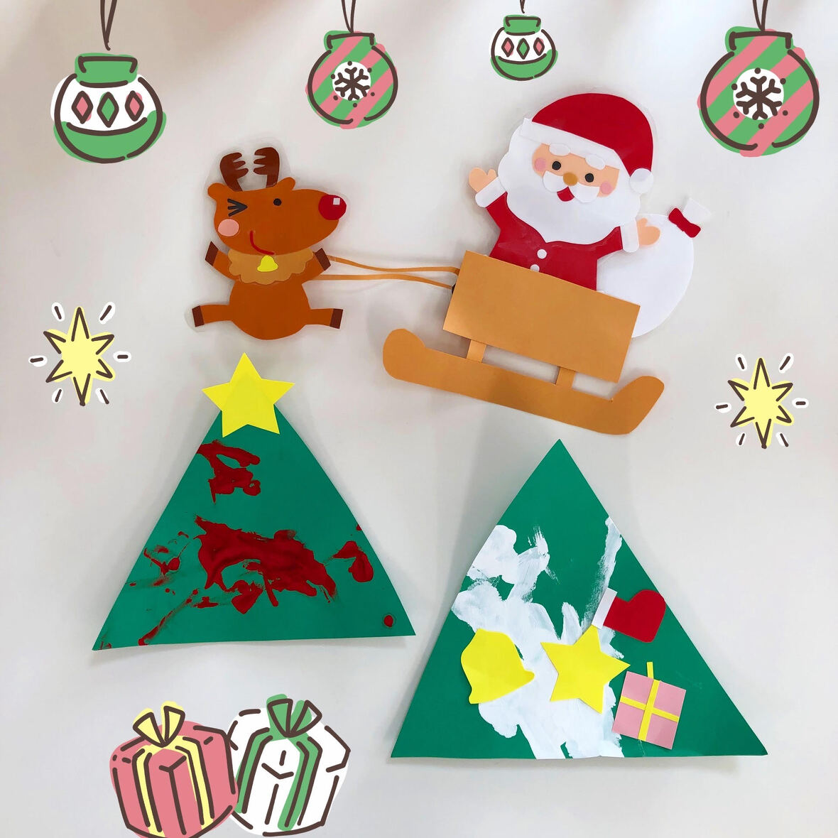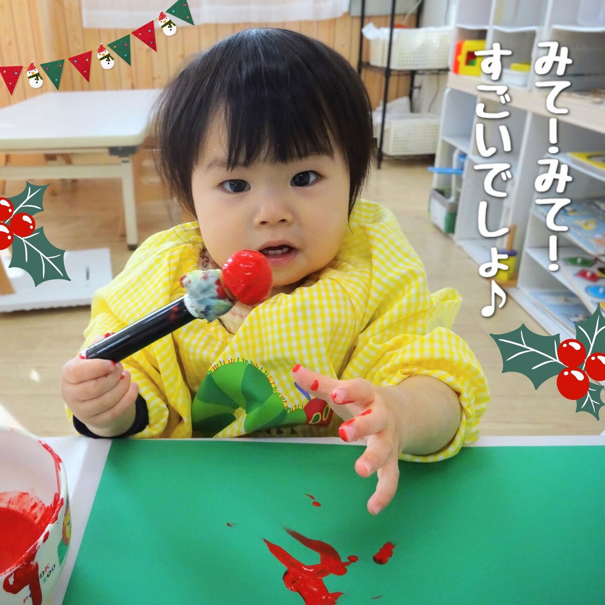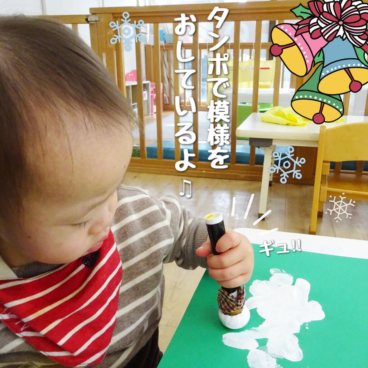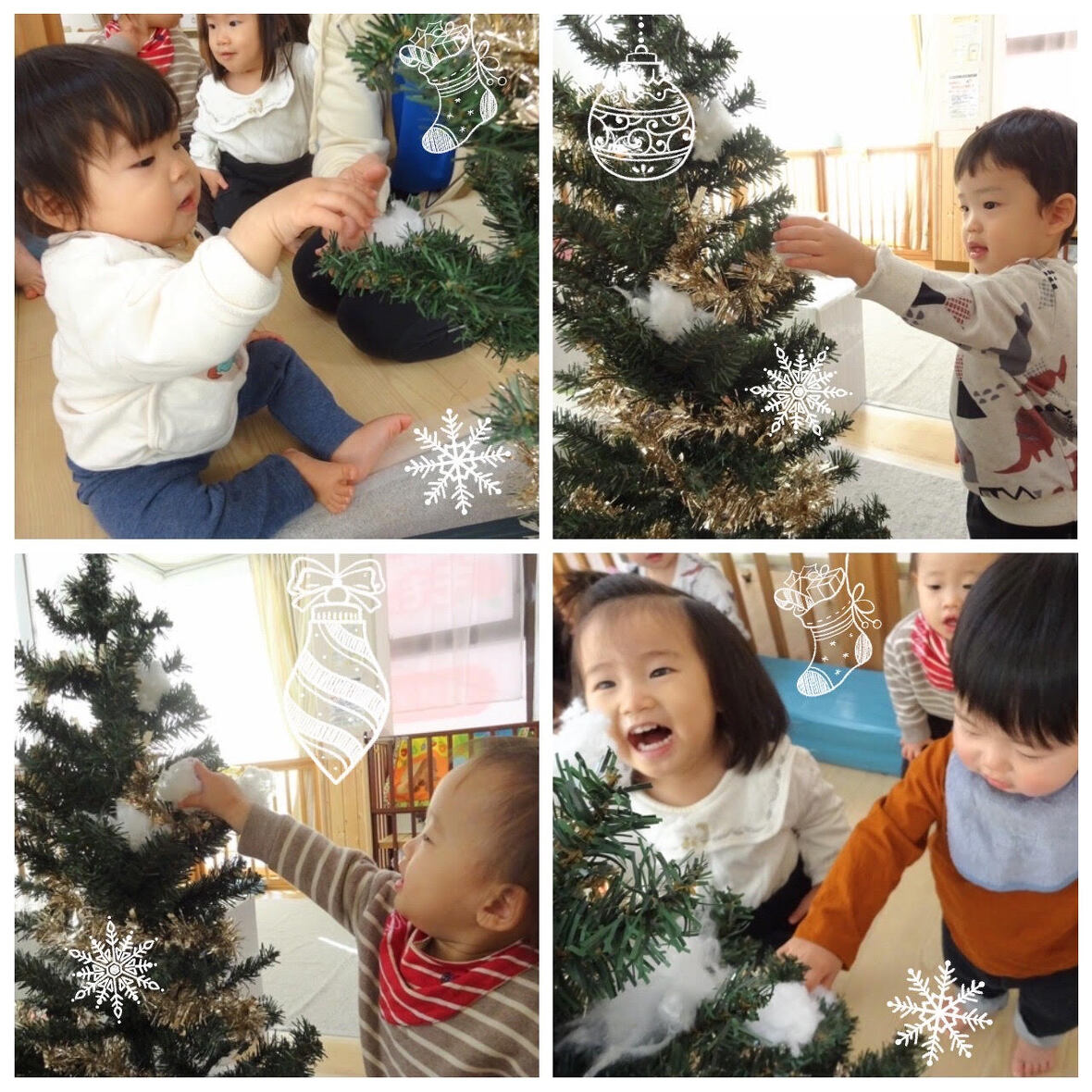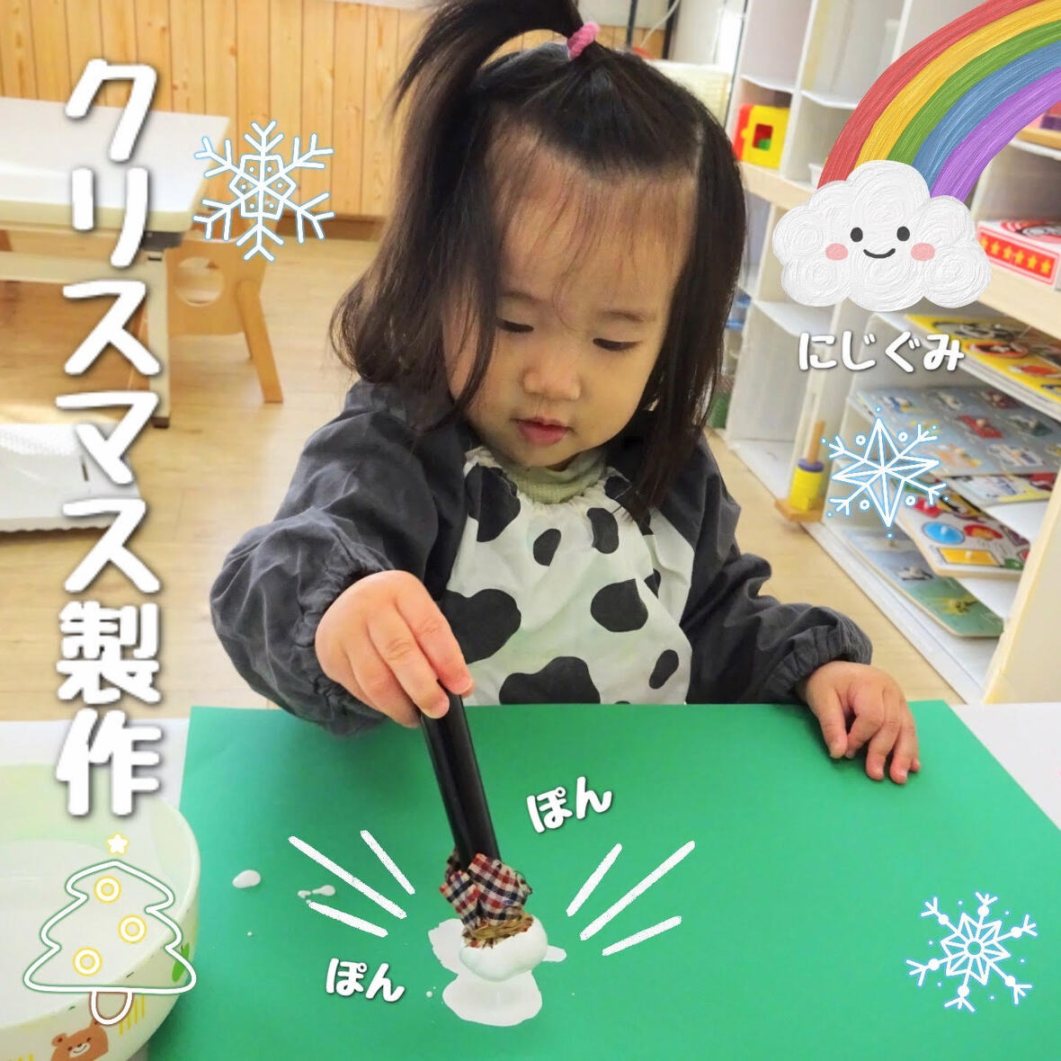 2023年12月21日(木) スタッフブログ にじぐみ/クリスマス製作 にじぐみのみんなでクリスマスツリーを作り ました(^o^) 緑の画用紙に赤や白の絵の具で模様をつけて いきます♪絵の具に興味を持ち、手で直接 触って楽しむ子もいましたよ☆彡 模様をつけた画用紙を三角に切ると、とても 可愛いらしいツリーの完成!! 壁に飾るとすっかりクリスマスの雰囲気です♪ もちろん本物のツリーも準備しました(^^) 子どもたちが1人1人、ワクワクしながら白い 綿をおきにいって...素敵なツリーへ大変身♫ クリスマスの準備は万端です(^_^)/