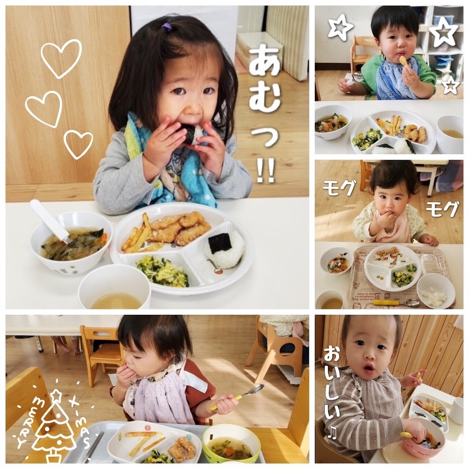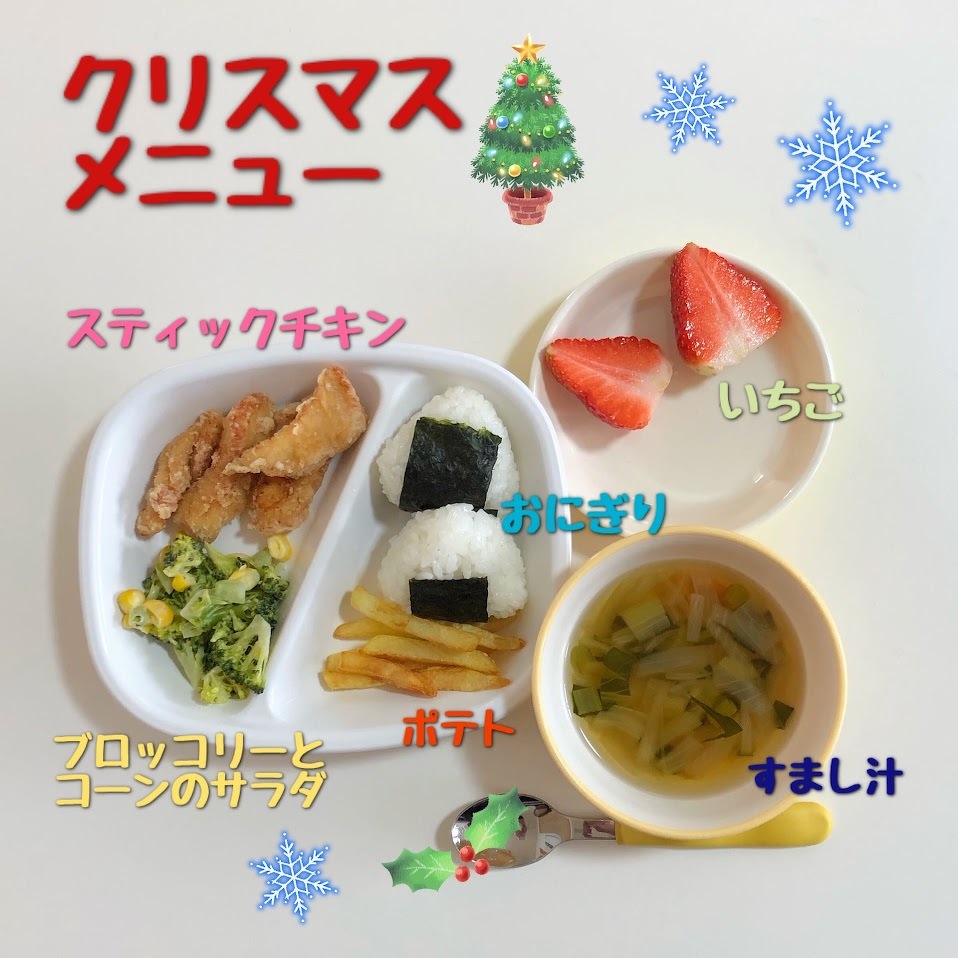 2023年12月27日(水) スタッフブログ 給食/クリスマスメニュー クリスマスメニューをご紹介します(^_^) ・スティックチキン ・フライドポテト ・ブロッコリーとコーンのサラダ ・おにぎり ・すまし汁 ・いちご 特別感のある内容になっています! みんなおいしそうに食べていました♫