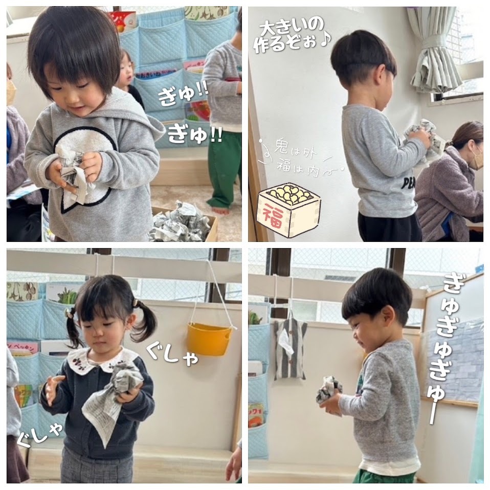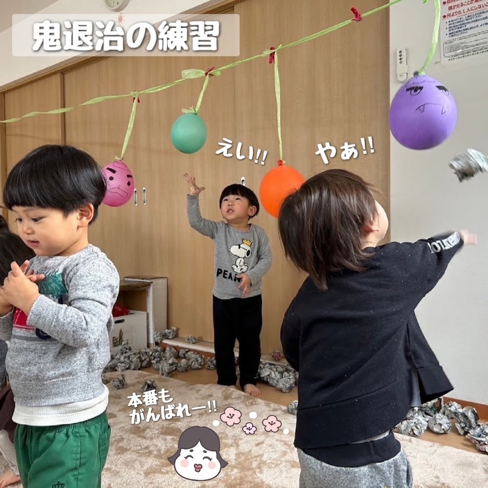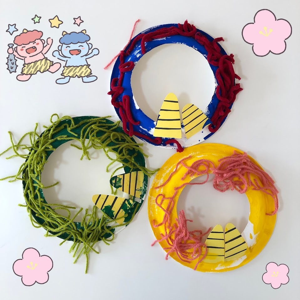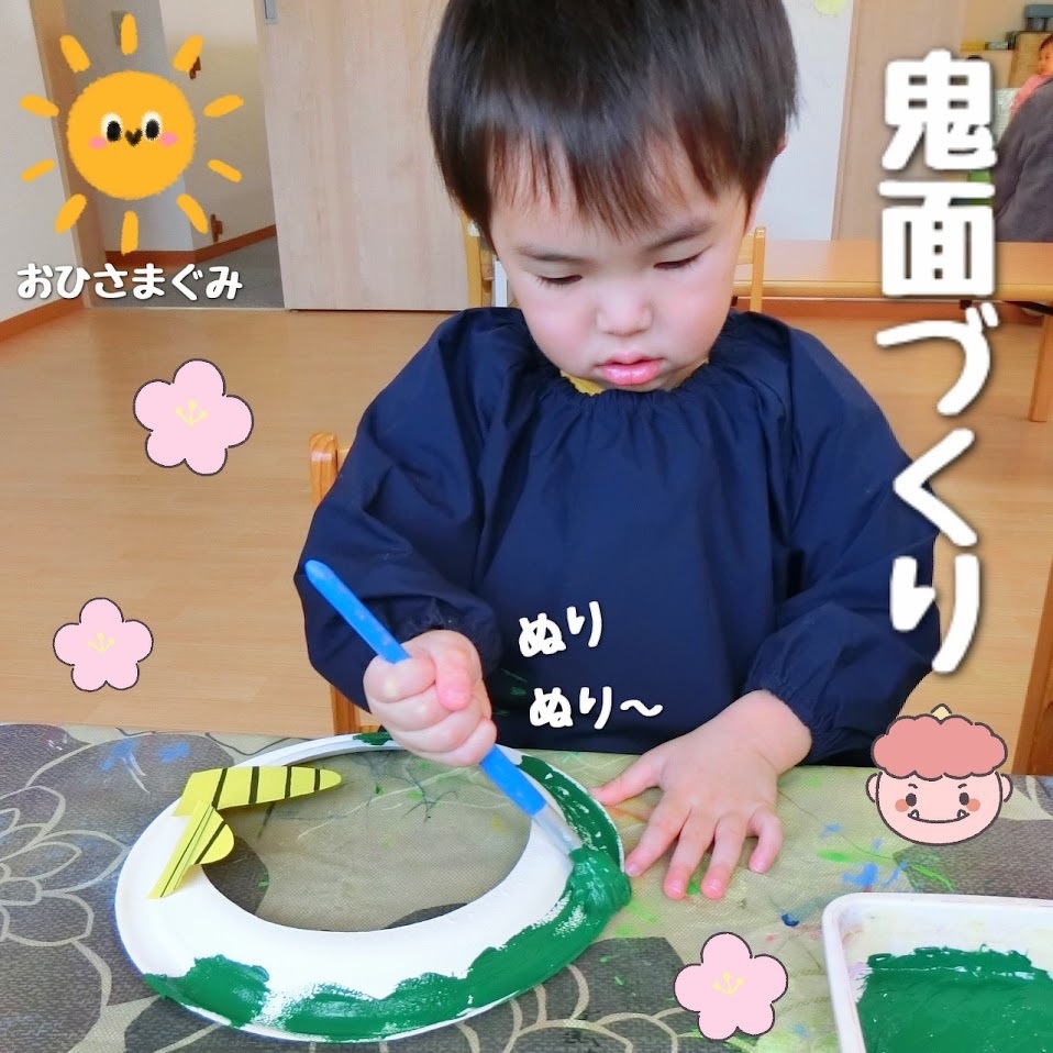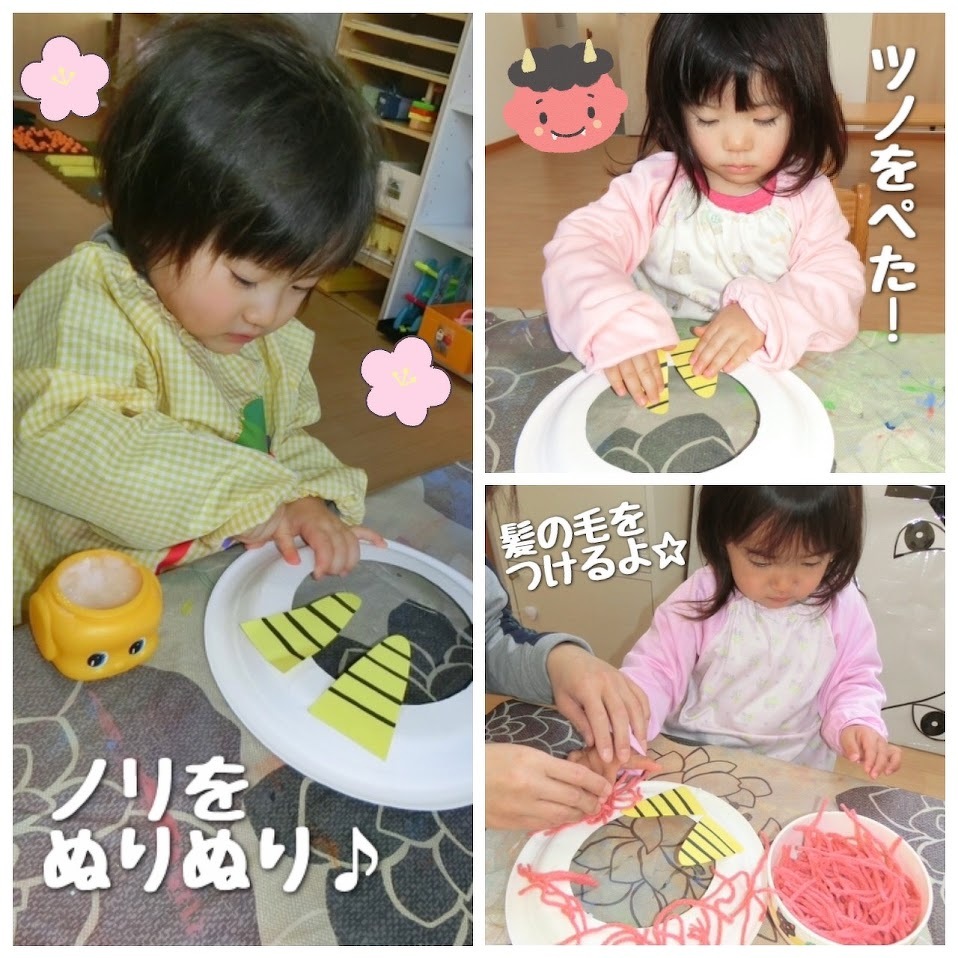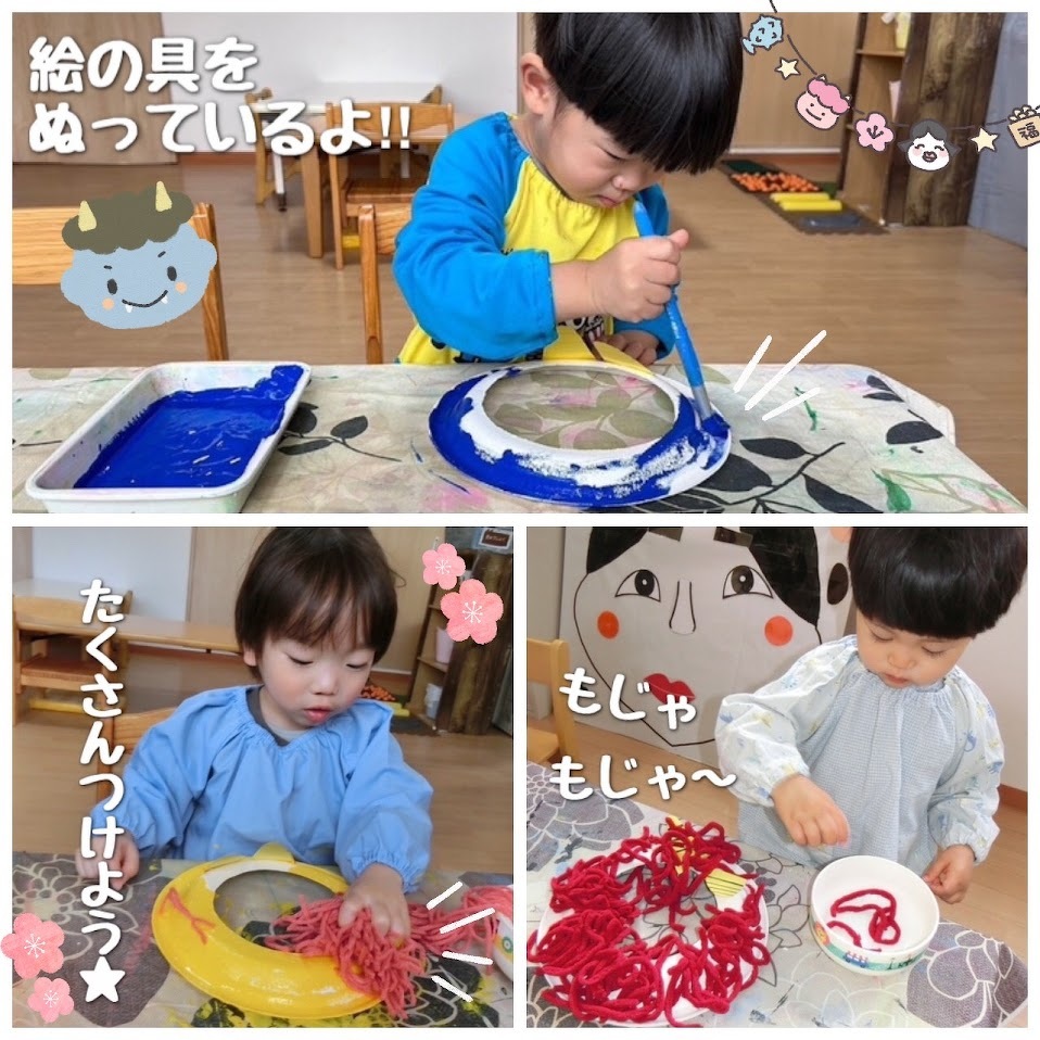 2024年01月30日(火) スタッフブログ おひさまぐみ/節分製作 節分会に向けて、鬼面や豆を作りました(^_^) ノリの容器に指を入れ、指についたノリを 『ぬりぬりぬり~』と塗り広げたあとに、 色とりどりの毛糸を鬼の髪の毛にみたてて 台紙に貼り付けていきます♫ 絵の具で台紙に色を塗った子も☆彡 かっこいい鬼面の完成です(^o^) 新聞紙を丸めて、鬼退治に使う豆の準備も しました!!たくさん作ったので、鬼が来ても 大丈夫です(>_<) ぶら下がった風船を的にして、豆まきの練習も しましたよ♪