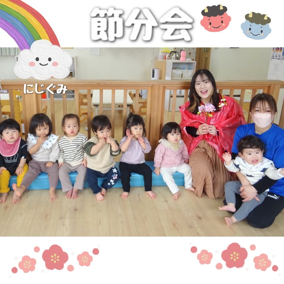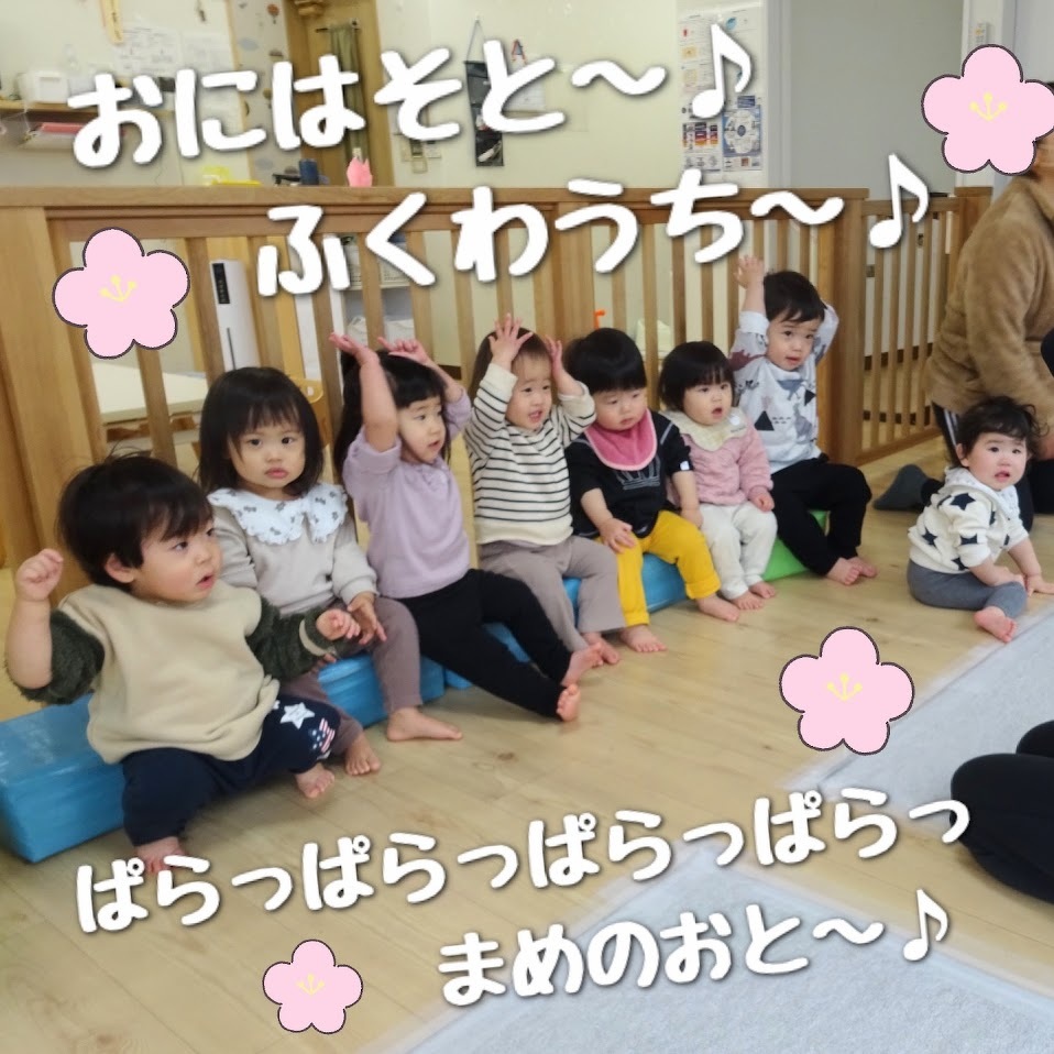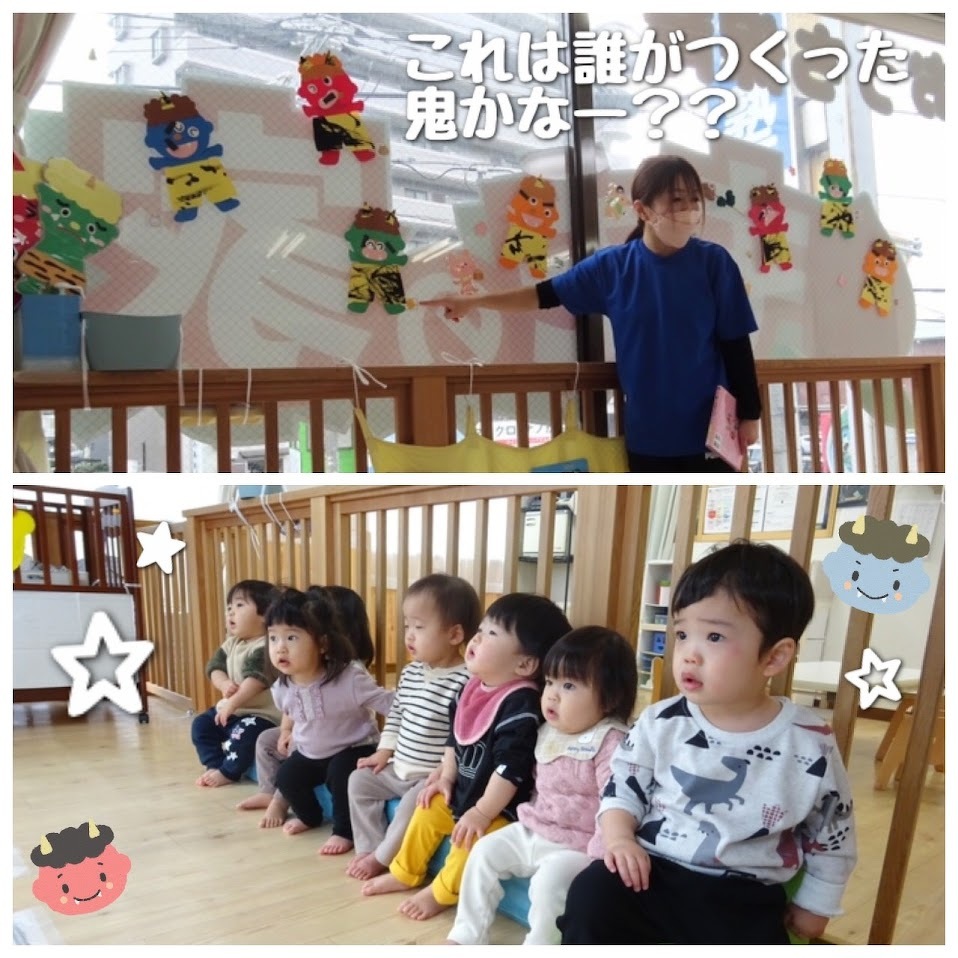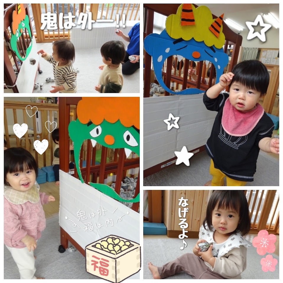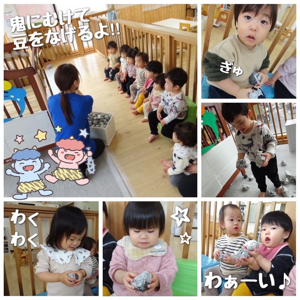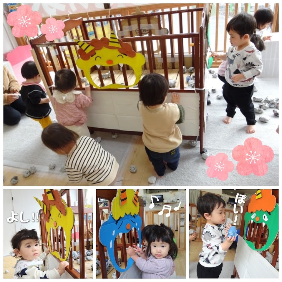 新聞紙で作った豆を鬼の大きなお口をめがけて
