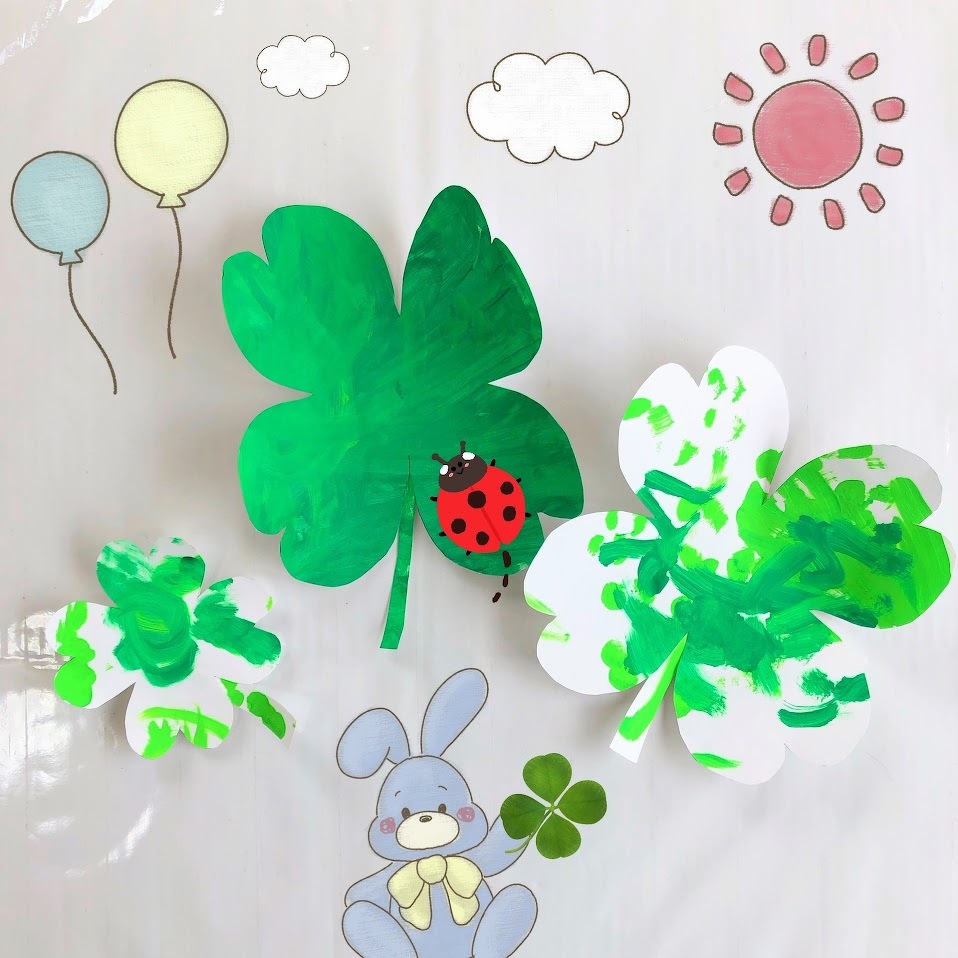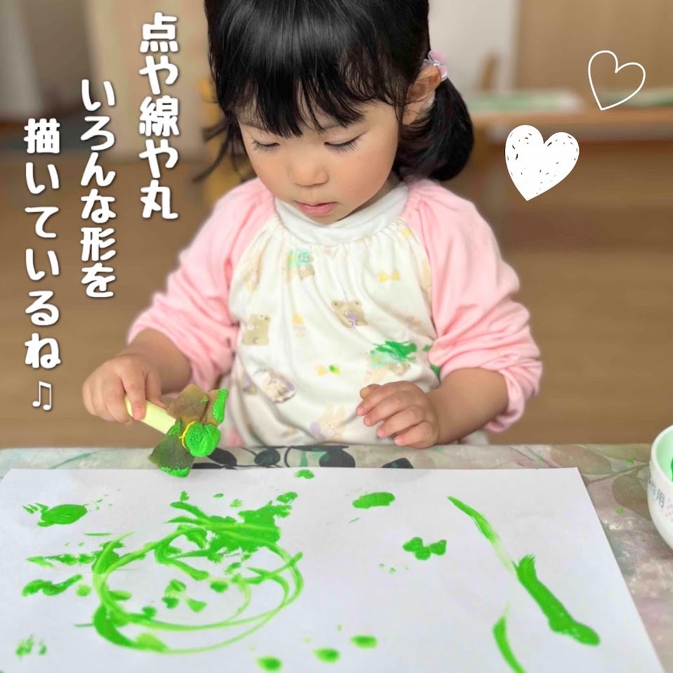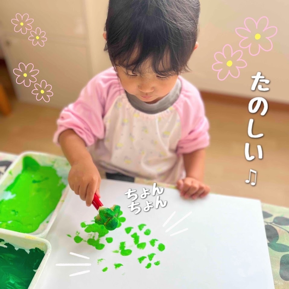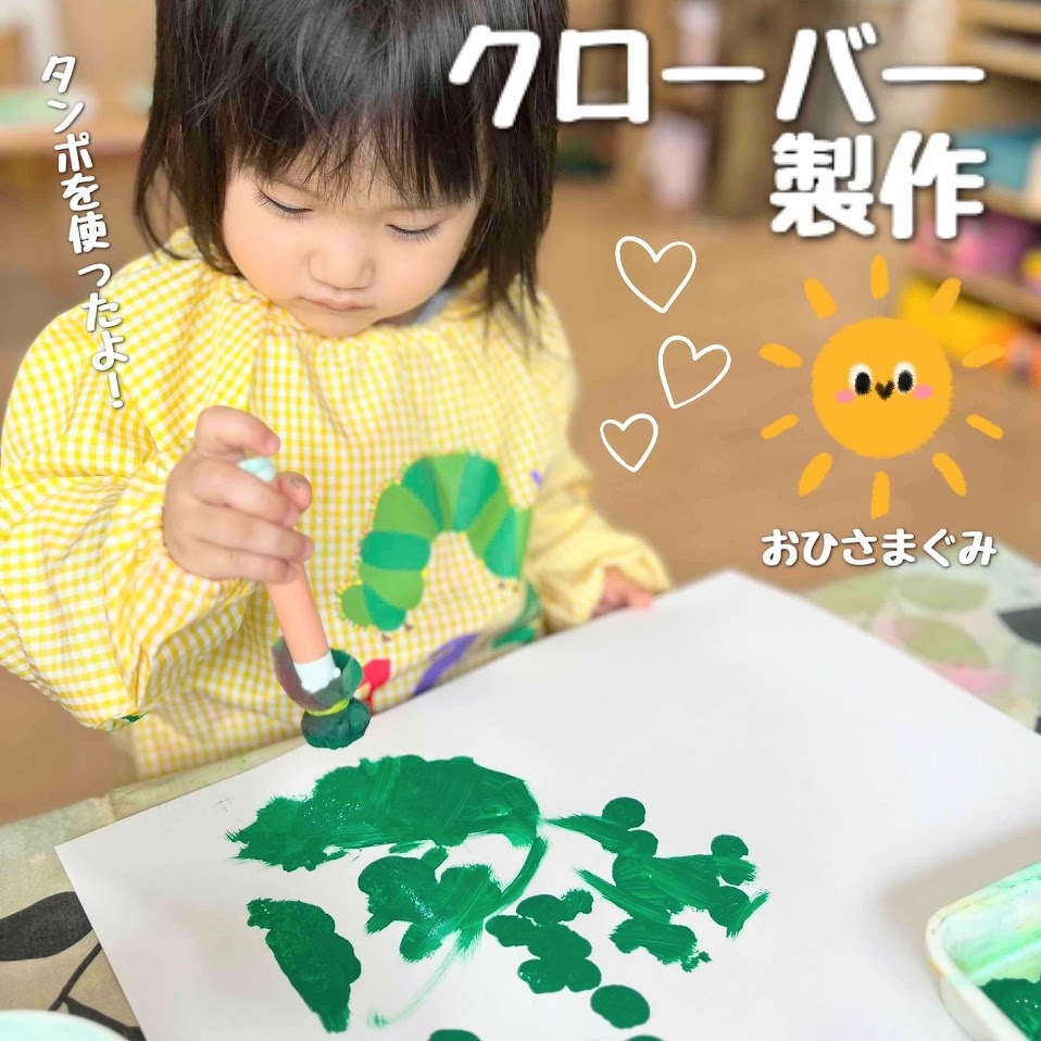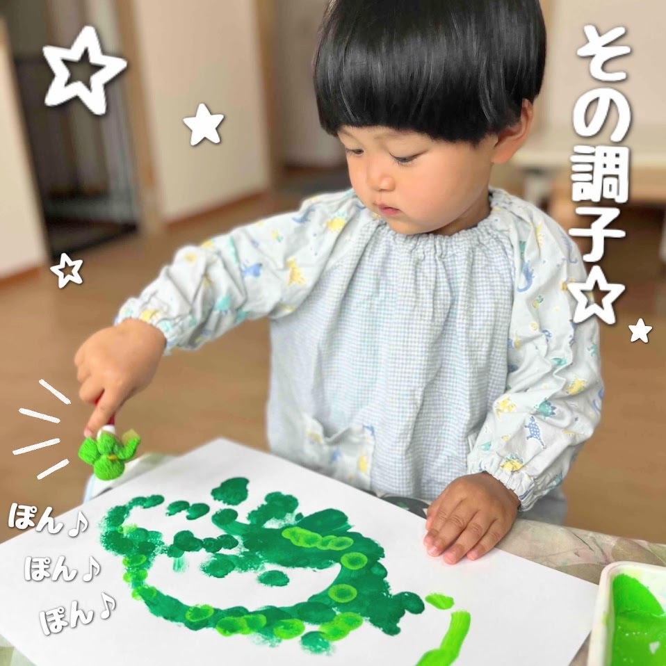 2024年05月21日(火) スタッフブログ おひさまぐみ/クローバー製作 おひさまぐみのみんなでタンポを使って クローバー作りをした時の様子です(^o^) 緑と黄緑の絵の具をつけて、白い画用紙に ポンポンと押していきます♪ 最初は慎重にゆっくりと・・・時間が経つに つれて、どんどんパワフルになり模様は画用紙 いっぱいに広がっていきました(^^)♪ 青々とした素敵なクローバーの完成です!