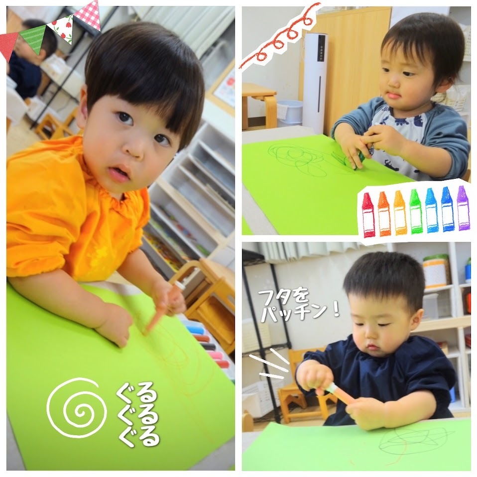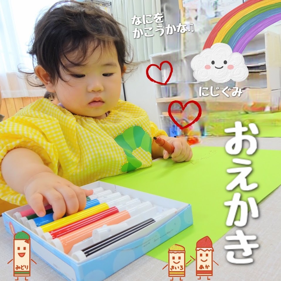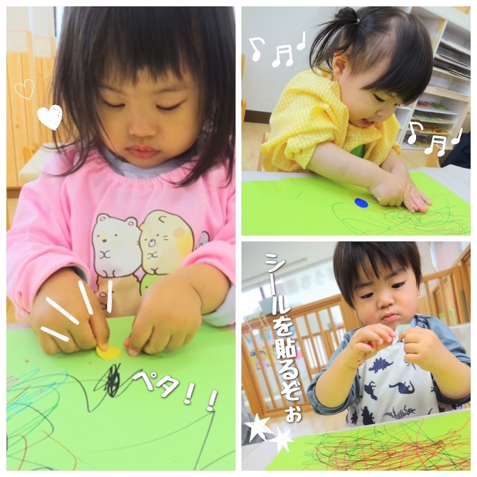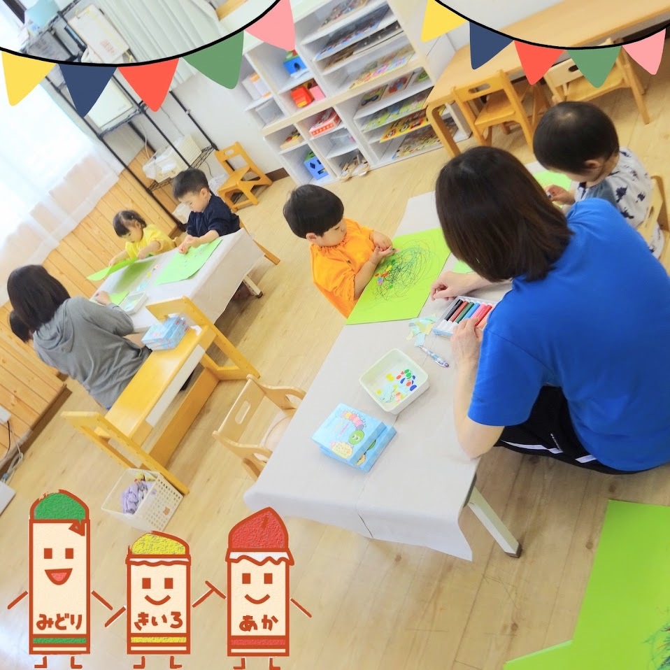 2024年05月29日(水) スタッフブログ にじぐみ/お絵描き にじぐみのみんなでお絵描きをしました(^o^) 腕を大きく動かして、線や丸をダイナミックに 書いていく子どもたち♫ あっという間に画用紙は色とりどりのペンで いっぱいになりました(^^)☆ 後半はシール貼りに挑戦してみる子も♪ この画用紙は先生が葉っぱの形にカットして お部屋の窓に飾っています(^_^)