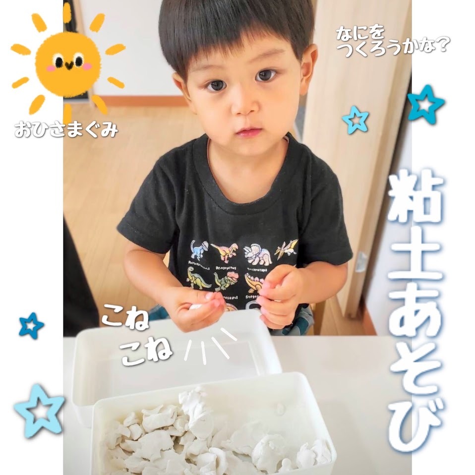 2024年06月25日(火) スタッフブログ おひさまぐみ/粘土あそび おひさまぐみのみんなで粘土あそびをした 時の様子をご紹介します(^o^) 粘土箱を開ける瞬間はまるで宝箱を開けるかの ように目をキラキラさせる子どもたち! 粘土をちぎったり、のばしたり、丸めたり… 夢中になってあそびます♫ 「〇〇だよ~!」と作ったものを見せて くれる子もいました(^^)♪ また粘土あそびしようね☆彡