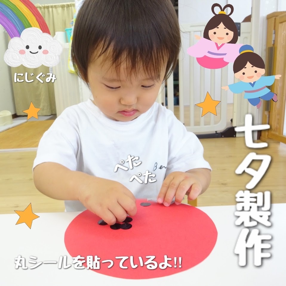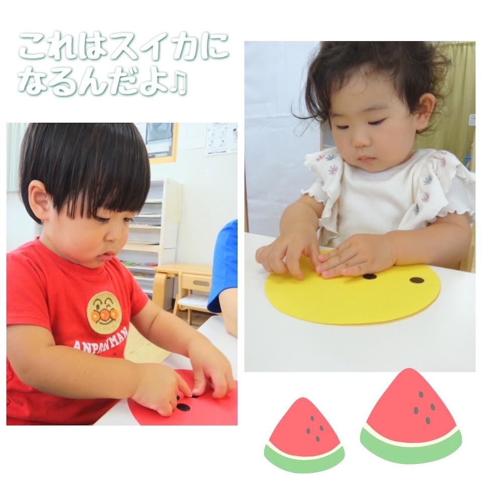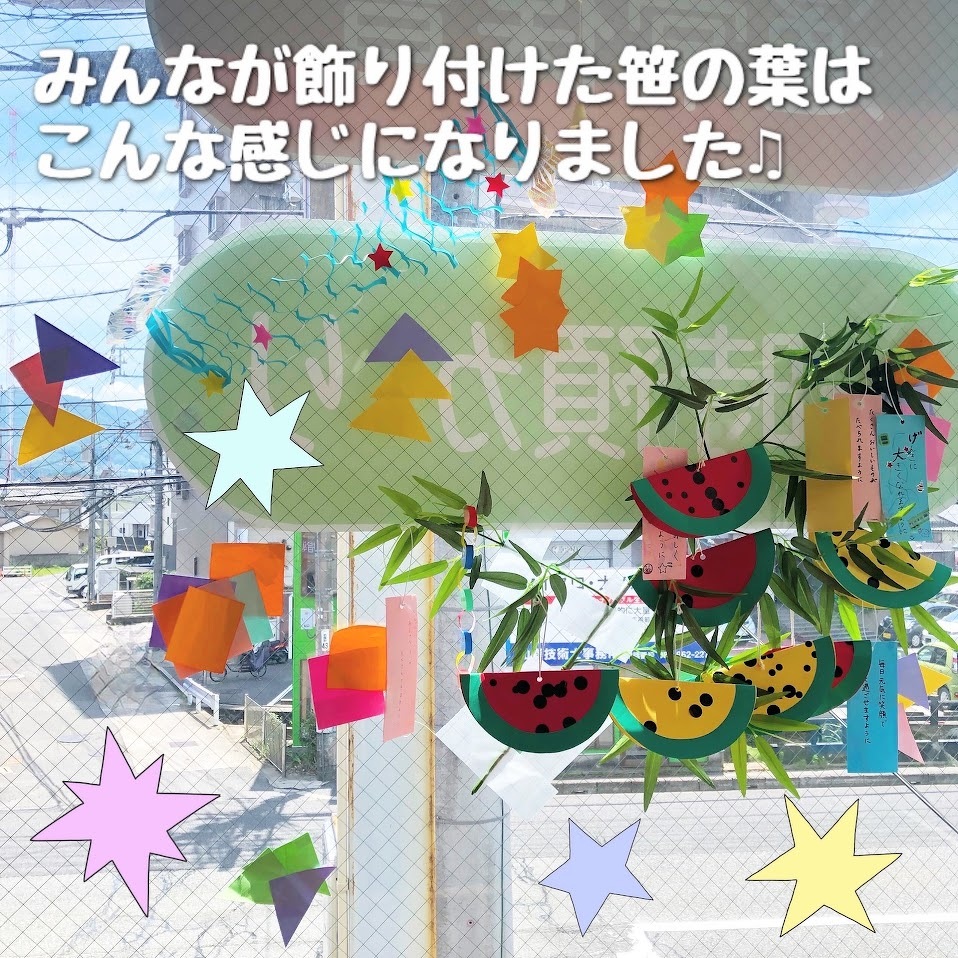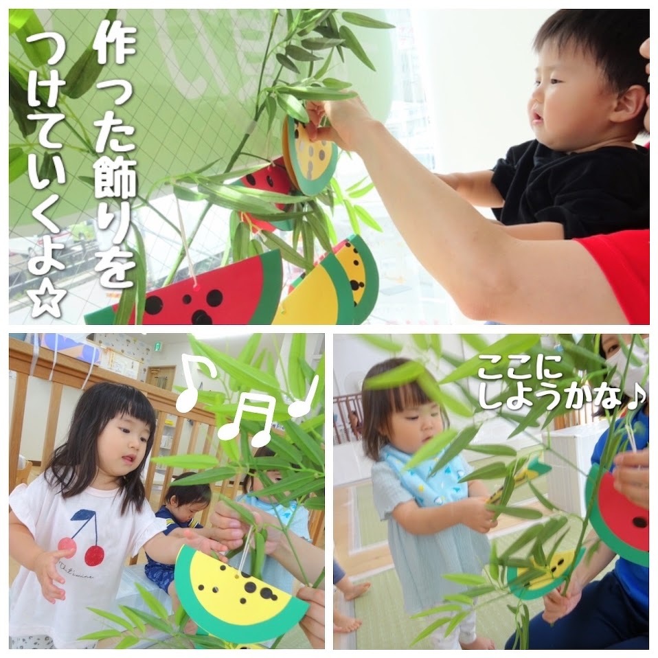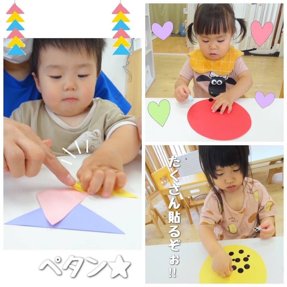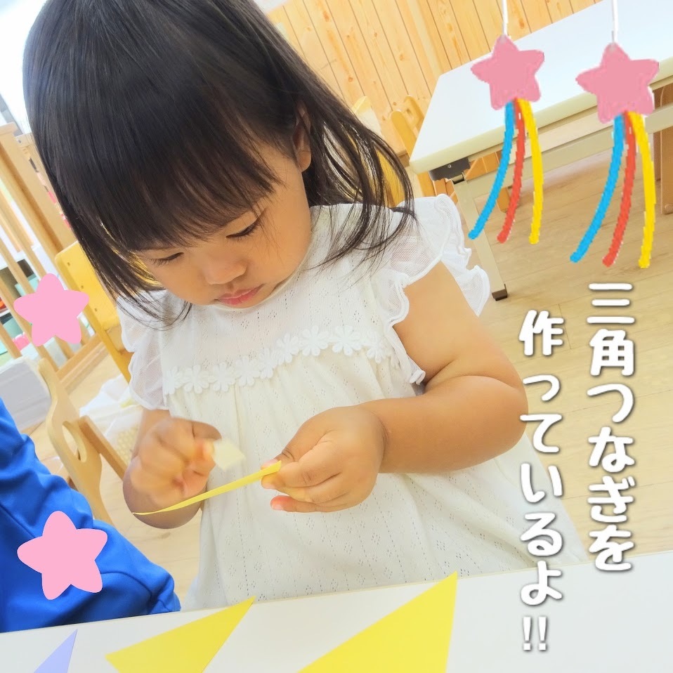 2024年07月04日(木) スタッフブログ にじぐみ/七夕製作 にじぐみのみんなで七夕の笹の葉に飾る 『スイカ』と『三角つなぎ』を作りました(^_^) スイカは赤や黄色の画用紙に種に見立てた 黒丸シールをペタペタ♪ おいしそうなスイカができました♪ 三角つなぎはいろんな色の三角をペタンと くっつけます☆彡 完成した可愛らしい飾りはみんなで笹の葉に 付けました(^o^) 今年は天の川が見られるといいですね♫