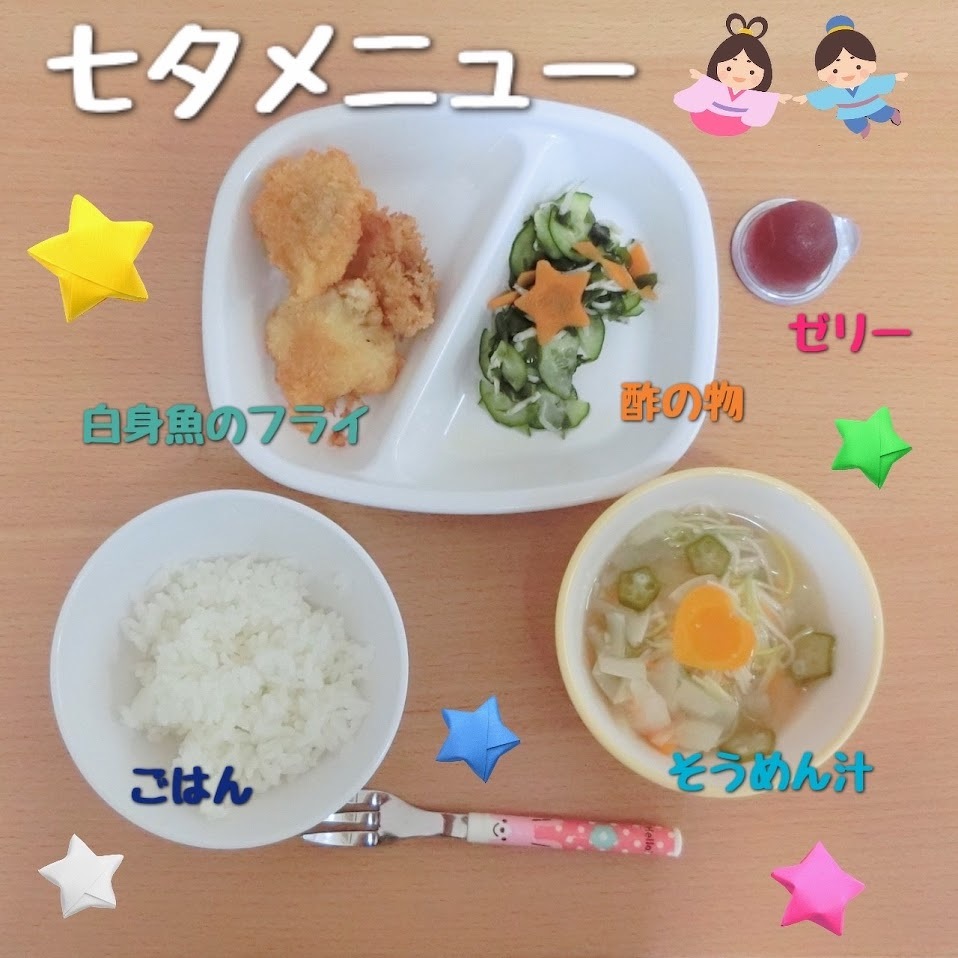2024年07月05日(金) スタッフブログ 給食/七夕メニュー 今日の給食は七夕の雰囲気を味わえる 子どもたちも嬉しい内容でした(^o^) ・白身魚のフライ ・酢の物(星型にんじん入り) ・そうめん汁(ハート型にんじん入り) ・ごはん ・ゼリー 星やハートの形をしたにんじんを見て 「これなんだ?」 「みてみて~♪」 と楽しそうでしたよ(^^)♫ 七夕の日は夜空を見上げてみてくださいね☆彡