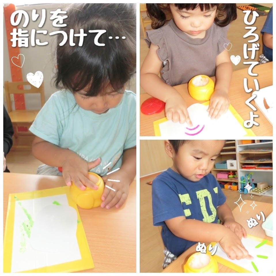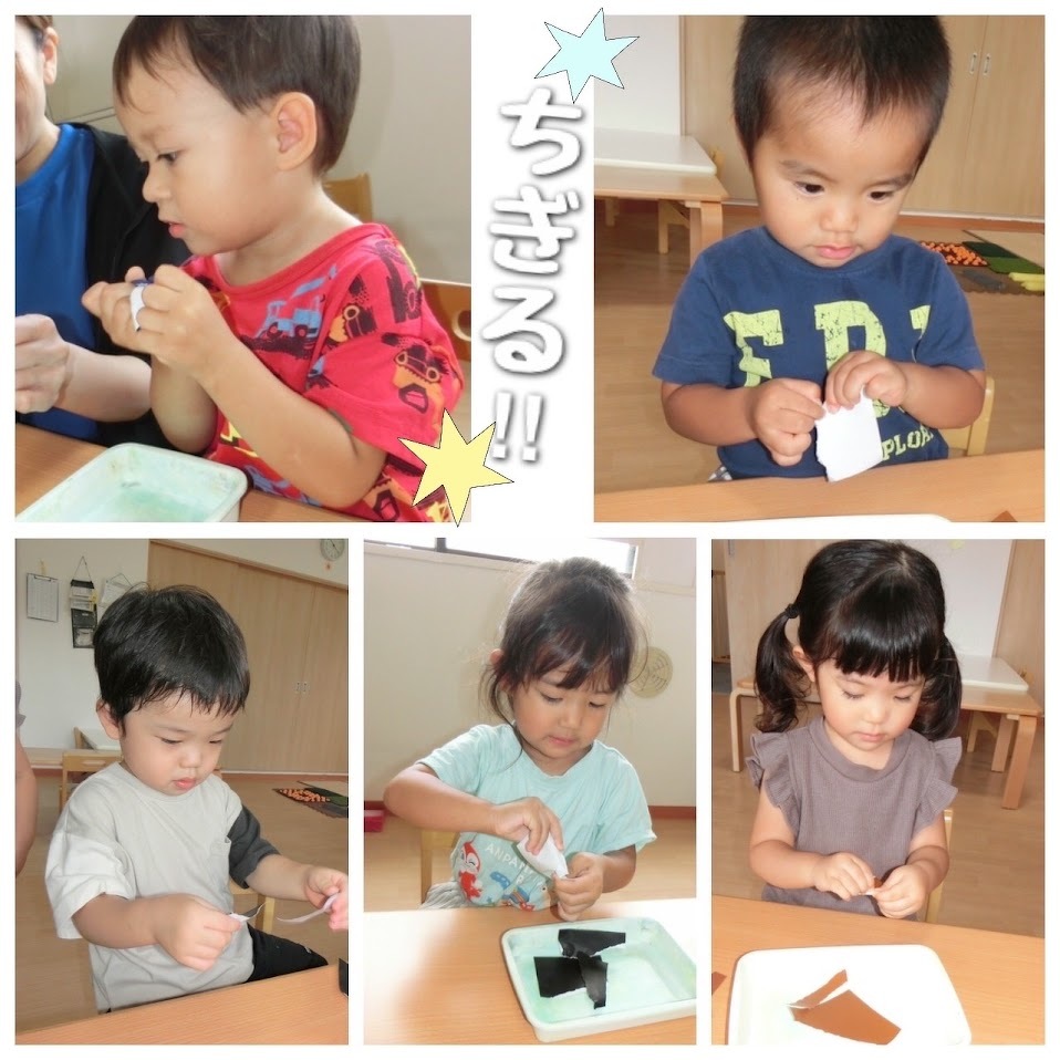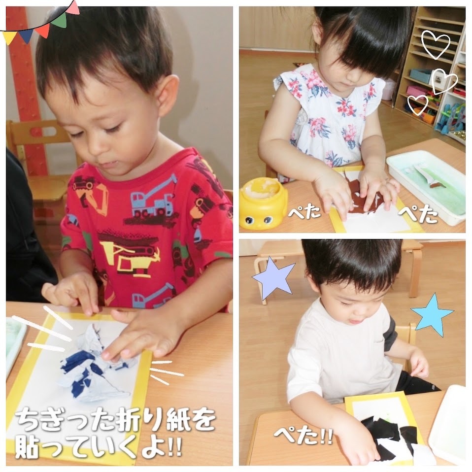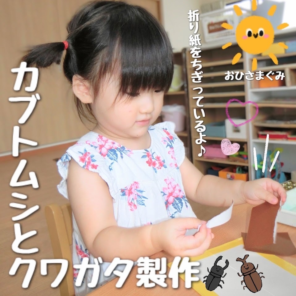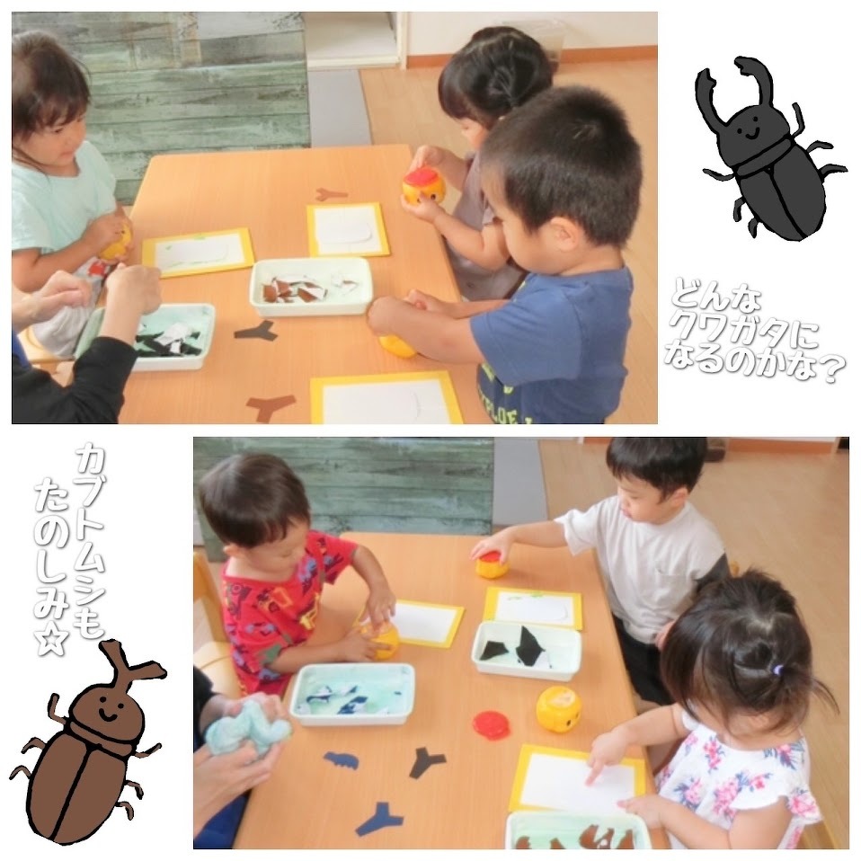 2024年07月23日(火) スタッフブログ おひさまぐみ/カブトムシとクワガタ製作 おひさまぐみでカブトムシとクワガタの製作を しました(^o^) 折り紙をちぎって、台紙にのりを塗り広げて ちぎった折り紙を貼り付けていきます♫ どちらの虫が良いか、何色の折り紙にするかは 子どもたちが選びました!! 完成の様子はまた後日☆彡