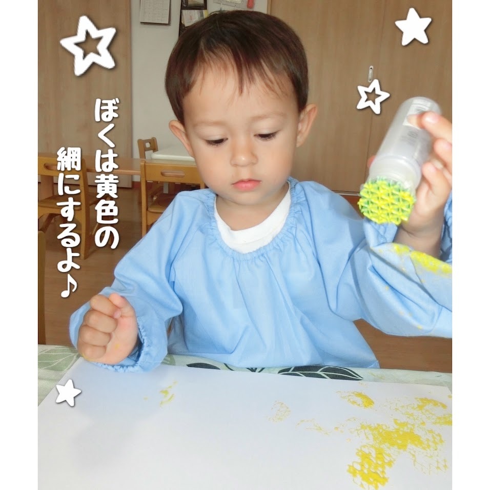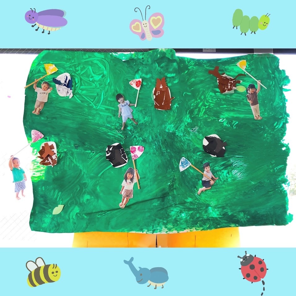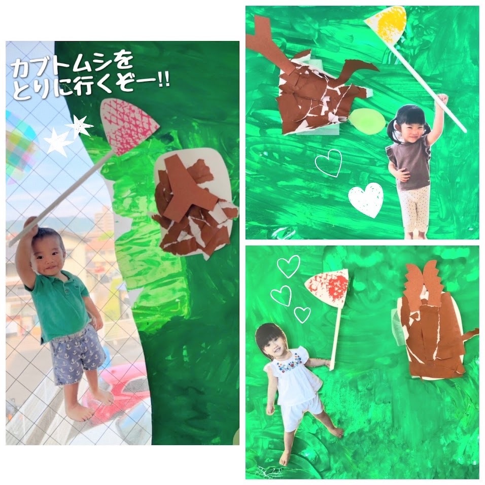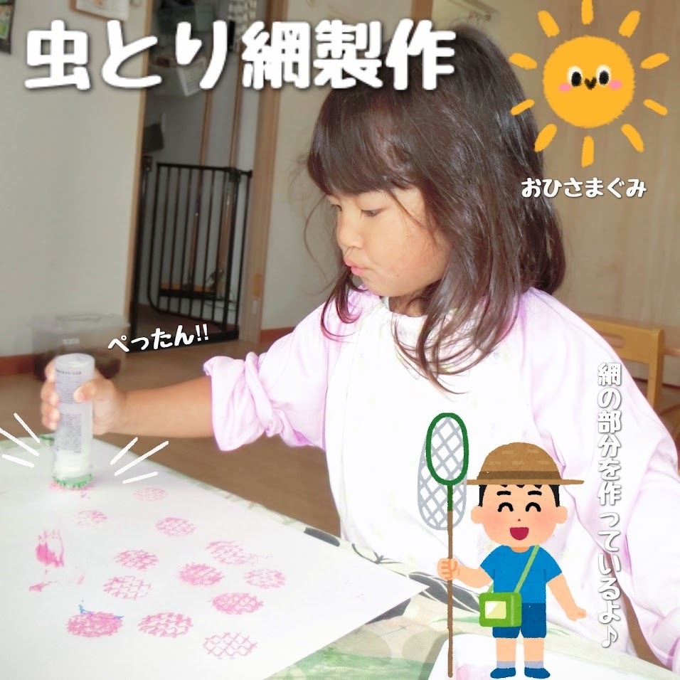 2024年08月09日(金) スタッフブログ おひさまぐみ/虫とり網製作 おひさまぐみで虫とり網の製作をした時の 様子です(^o^) 好きな色を選び、網目模様のついたスタンプを 押していきました♫ ペタンとして画用紙に色がついていくのを 不思議そうに見ながら、何回もスタンプを 押していく子どもたち☆彡 フィンガーペイントで作った緑の模造紙は 大きな木になり、みんなが作ったカブトムシと クワガタがとまっています! それをとろうと子どもたちが虫とり網を持って いる夏らしい作品となりました(^^)♪