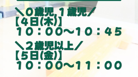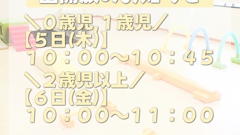 在園児と一緒に広いスタジオで遊具を使った 遊びやリズム体操を行います。 ぜひご参加ください。 見学や入園相談も随時受け付けております ので、お気軽にお問い合わせください。 ◆園開放日 0歳児・1歳児 7月3日(...