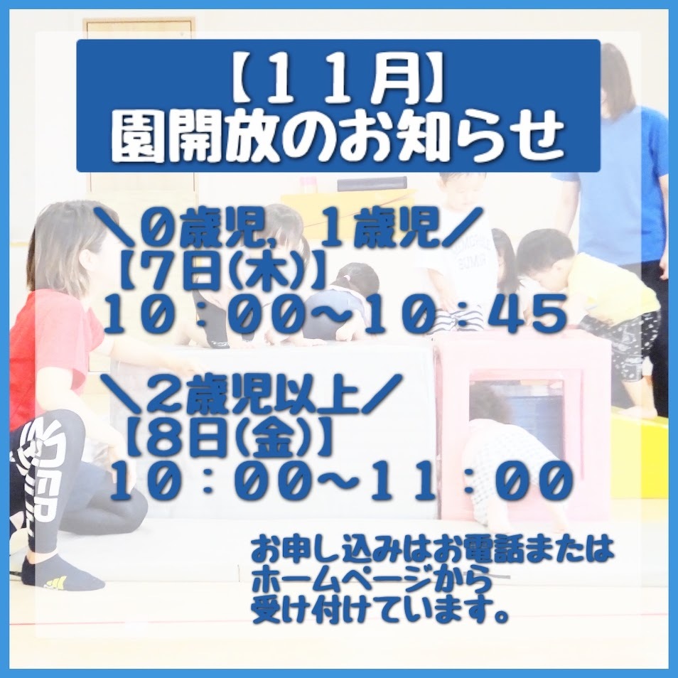 2024年10月08日(火) お知らせ 11月/園開放のお知らせ 在園児と一緒に広いスタジオで遊具を使った 遊びやリズム体操を行います。 ぜひご参加ください。 見学や入園相談も随時受け付けております ので、お気軽にお問い合わせください。 ◆園開放日 0歳児・1歳児 11月7日(木) 10:00~10:45 2歳児以上 11月8日(金) 10:00~11:00