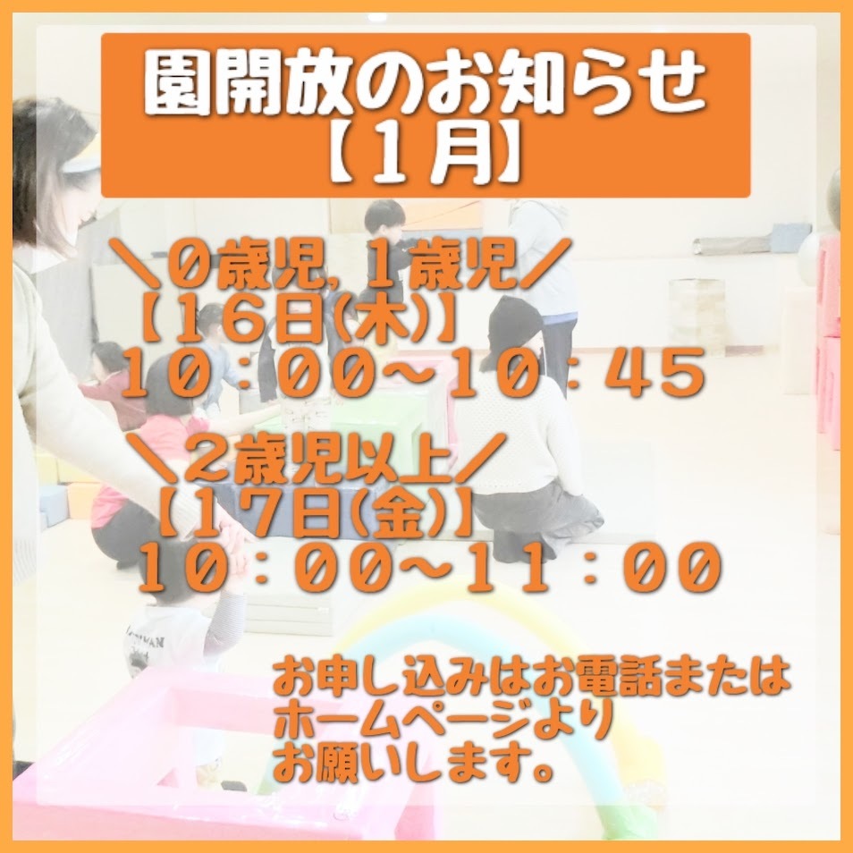 2024年12月20日(金) お知らせ 1月/園開放のお知らせ 在園児と一緒に広いスタジオで遊具を使った 遊びやリズム体操を行います。 ぜひご参加ください。 見学や入園相談も随時受け付けております ので、お気軽にお問い合わせください。 ◆園開放日 0歳児・1歳児 1月16日(木) 10:00~10:45 2歳児以上 1月17日(金) 10:00~11:00