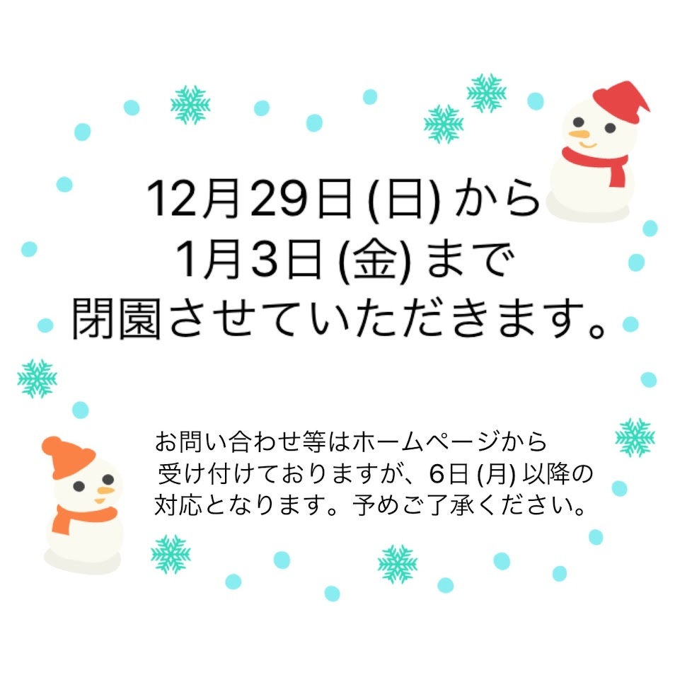 2024年12月27日(金) お知らせ 年末年始閉園のお知らせ 12月29日(日)から1月3日(金)まで閉園させて いただきます。 お問い合わせ等はホームページから受け付けて おりますが、6日(月)以降の対応になります。 予めご了承ください。 本年もありがとうございました(^o^) 良いお年をお迎えください☆彡