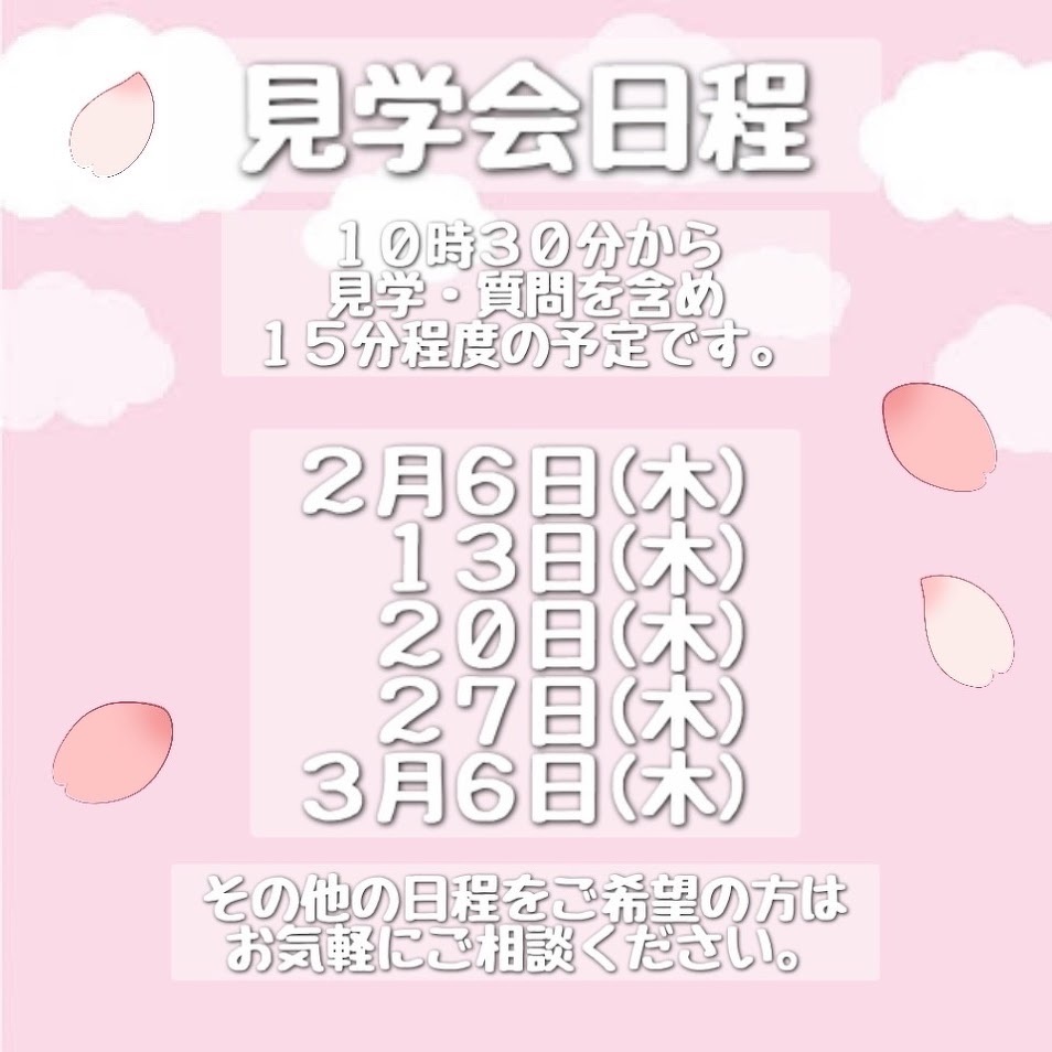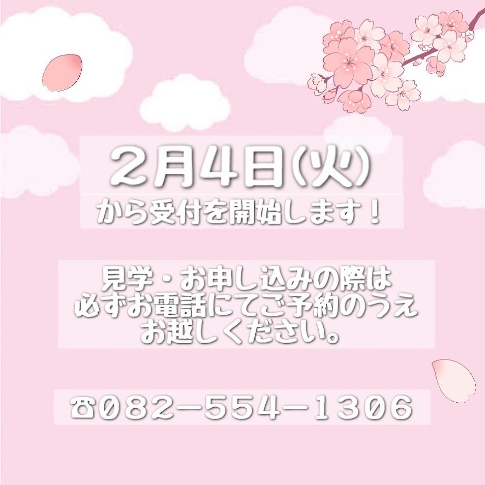 2025年01月28日(火) お知らせ 【令和7年度 入園受付について】 ◆入園申し込み受付開始日 2月4日(火)~ ◆見学会日程 10時30分から見学・質問を含め 15分程度の予定です。 2月6日(木) 13日(木) 20日(木) 27日(木) 3月6日(木) ※上記以外の日程をご希望の方は お気軽にご相談ください。 ※見学・申し込みの際は必ずお電話にて ご予約のうえお越しください。 【TEL:082-554-1306】