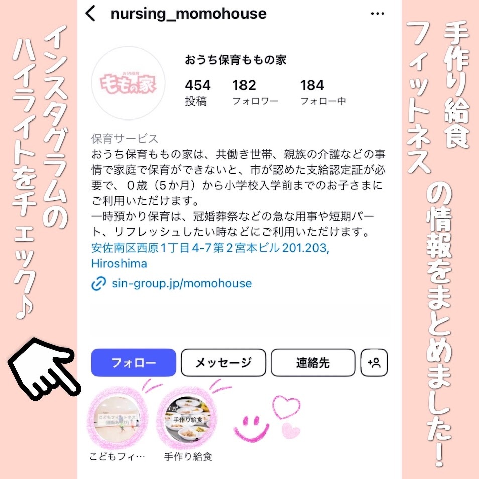 2025年02月10日(月) お知らせ インスタグラムについてのお知らせです! みなさまからよくご質問をいただく 『手作り給食』と『フィットネス』について インスタグラムのハイライトに情報を まとめました♫ ぜひご覧ください(^o^)