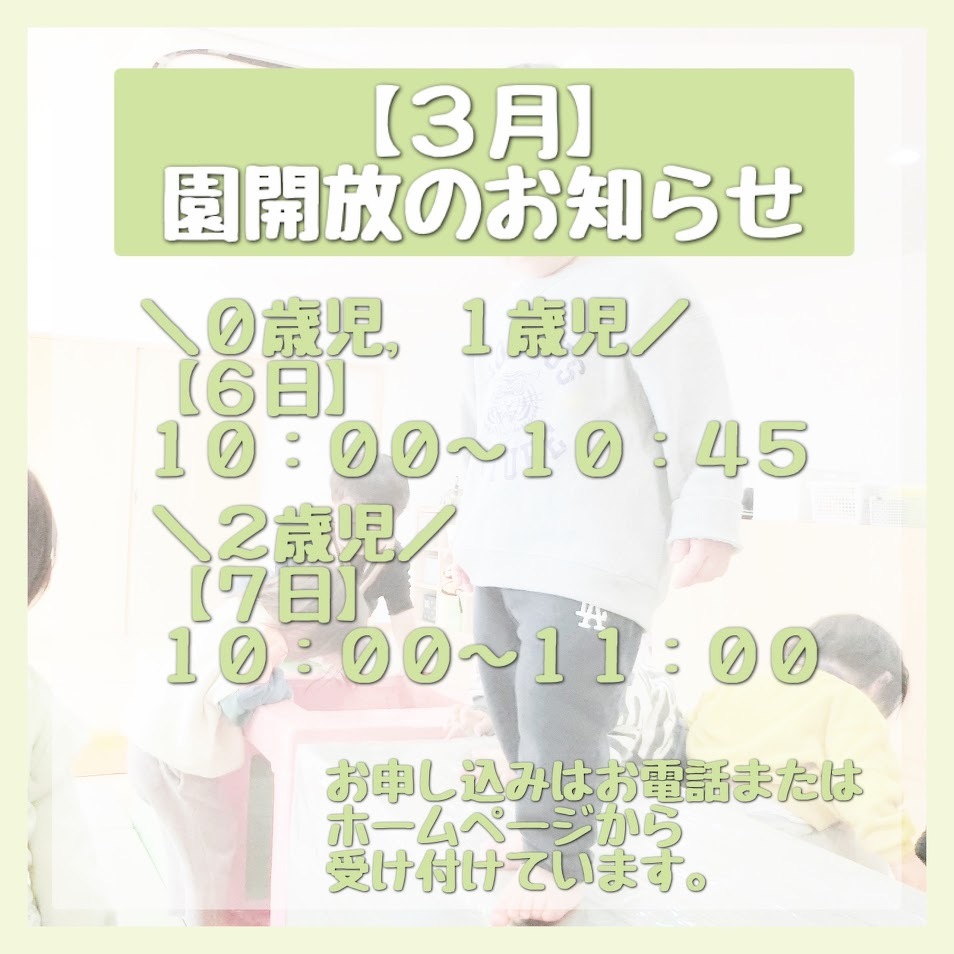 2025年02月19日(水) お知らせ 3月/園開放のお知らせ 在園児と一緒に広いスタジオで遊具を使った 遊びやリズム体操を行います。 ぜひご参加ください。 見学や入園相談も随時受け付けております ので、お気軽にお問い合わせください。 ◆園開放日 0歳児・1歳児 3月6日(木) 10:00~10:45 2歳児以上 3月7日(金) 10:00~11:00