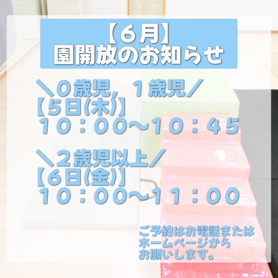 2025年05月16日(金) お知らせ 6月/園開放のお知らせ 在園児と一緒に広いスタジオで遊具を使った 遊びやリズム体操を行います。 ぜひご参加ください。 見学や入園相談も随時受け付けております ので、お気軽にお問い合わせください。 ◆園開放日 0歳児・1歳児 6月5日(木) 10:00~10:45 2歳児以上 6月6日(金) 10:00~11:00