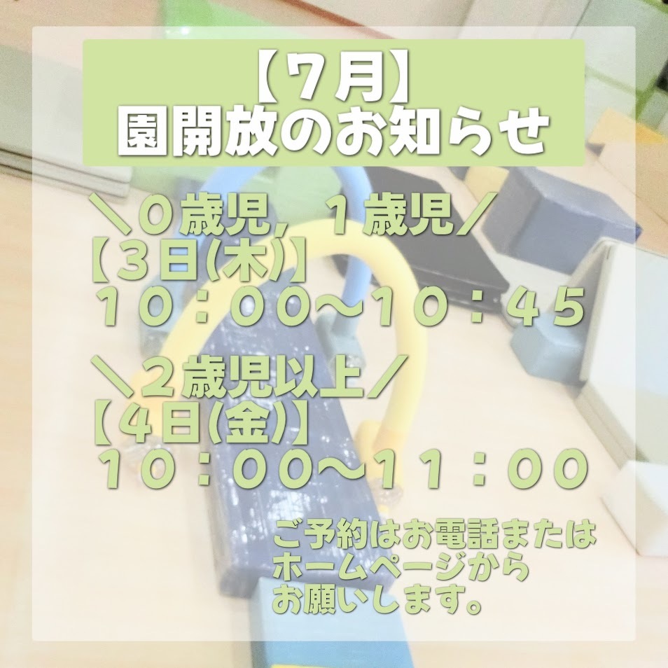 2025年06月09日(月) お知らせ 7月/園開放のお知らせ 在園児と一緒に広いスタジオで遊具を使った 遊びやリズム体操を行います。 ぜひご参加ください。 見学や入園相談も随時受け付けております ので、お気軽にお問い合わせください。 ◆園開放日 0歳児・1歳児 7月3日(木) 10:00~10:45 2歳児以上 7月4日(金) 10:00~11:00