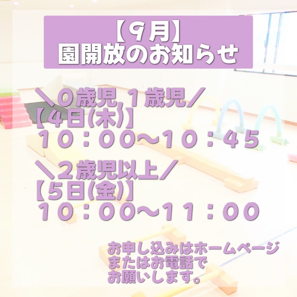 2025年08月11日(月) お知らせ 9月/園開放のお知らせ 在園児と一緒に広いスタジオで遊具を使った 遊びやリズム体操を行います。 ぜひご参加ください。 見学や入園相談も随時受け付けております ので、お気軽にお問い合わせください。 ◆園開放日 0歳児・1歳児 9月4日(木) 10:00~10:45 2歳児以上 9月5日(金) 10:00~11:00