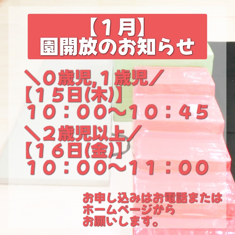 2025年12月08日(月) お知らせ 1月/園開放のお知らせ 在園児と一緒に広いスタジオで遊具を使った 遊びやリズム体操を行います。 ぜひご参加ください。 見学や入園相談も随時受け付けております ので、お気軽にお問い合わせください。 ◆園開放日 0歳児・1歳児 1月15日(木) 10:00~10:45 2歳児以上 1月16日(金) 10:00~11:00