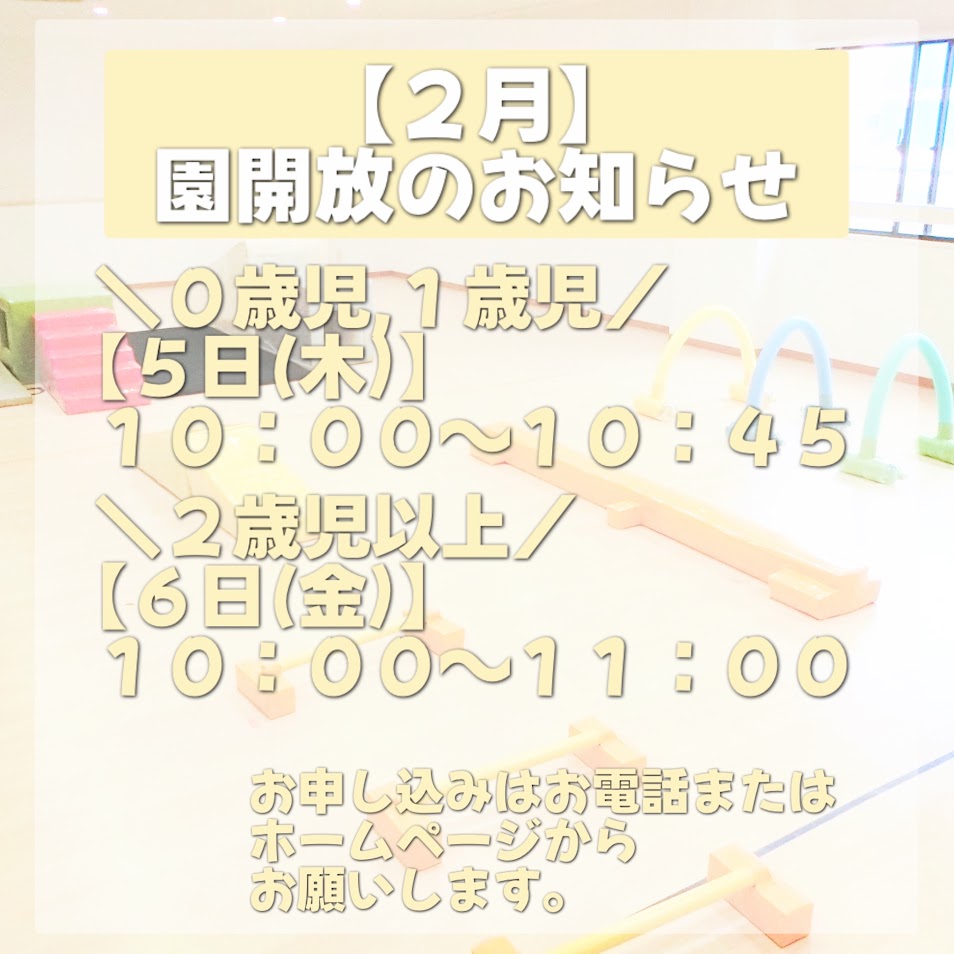 2026年01月19日(月) お知らせ 2月/園開放のお知らせ 在園児と一緒に広いスタジオで遊具を使った 遊びやリズム体操を行います。 ぜひご参加ください。 見学や入園相談も随時受け付けております ので、お気軽にお問い合わせください。 ◆園開放日 0歳児・1歳児 2月5日(木) 10:00~10:45 2歳児以上 2月6日(金) 10:00~11:00