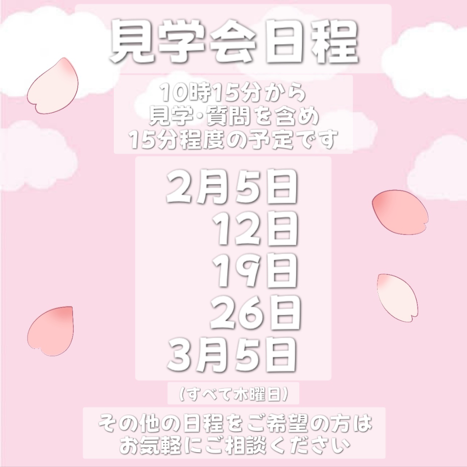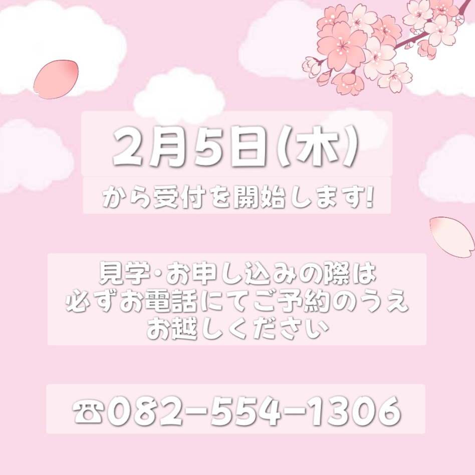 2026年02月02日(月) お知らせ 【令和8年度 入園受付について】 ◆入園申し込み受付開始日 2月5日(木)~ ◆見学会日程 10時15分から見学・質問を含め 15分程度の予定です。 2月5日(木) 12日(木) 19日(木) 26日(木) 3月5日(木) ※上記以外の日程をご希望の方は お気軽にご相談ください。 ※見学・申し込みの際は必ずお電話にて ご予約のうえお越しください。 【TEL:082-554-1306】