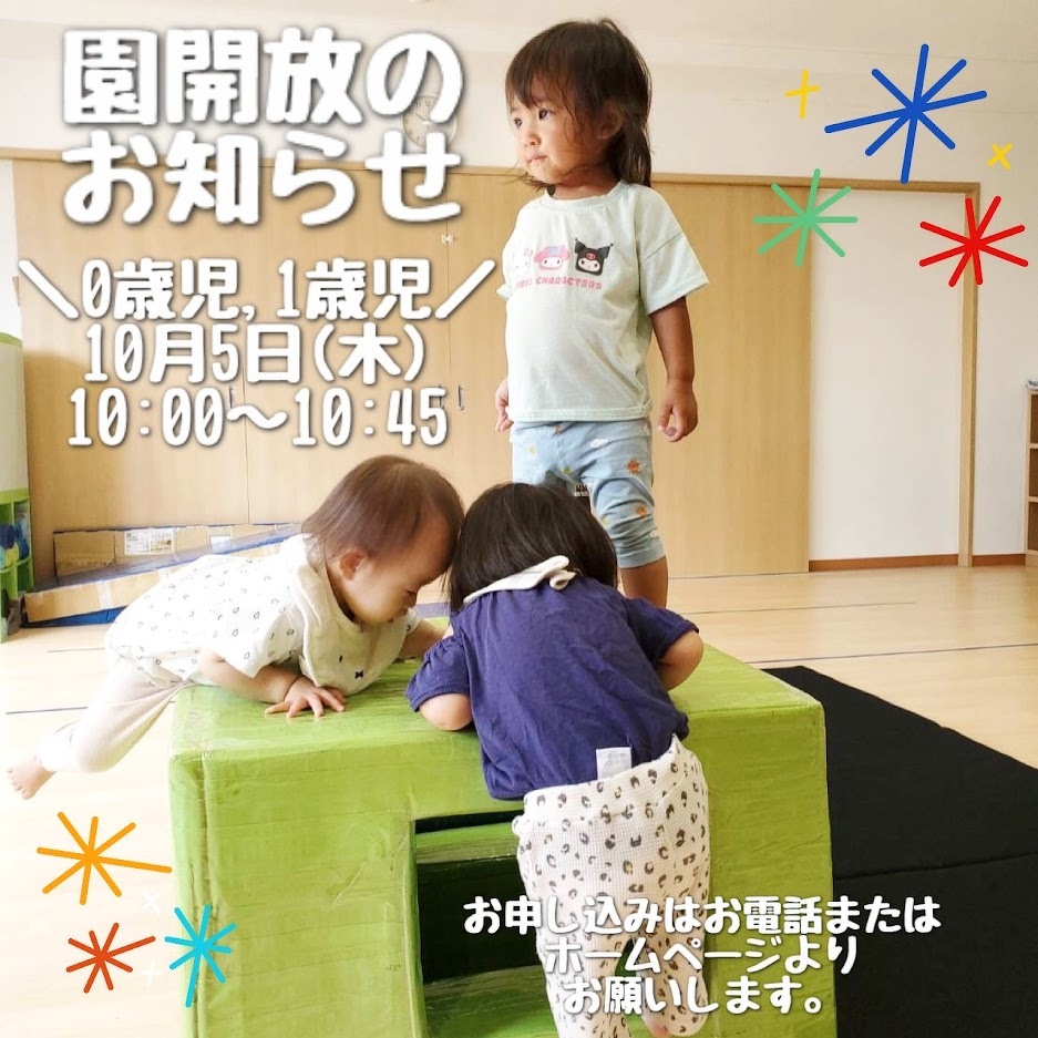 2023年09月14日(木) お知らせ 10月/園開放のお知らせ(0歳児、1歳児) 在園児と一緒に広いスタジオで遊具を使った 遊びやリズム体操を行います。 ぜひご参加ください。 見学や入園相談も随時受け付けております ので、お気軽にお問い合わせください。 ◆園開放日 0歳児・1歳児 10月5日(木) 10:00~10:45 2歳児以上 10月6日(金) 10:00~11:00