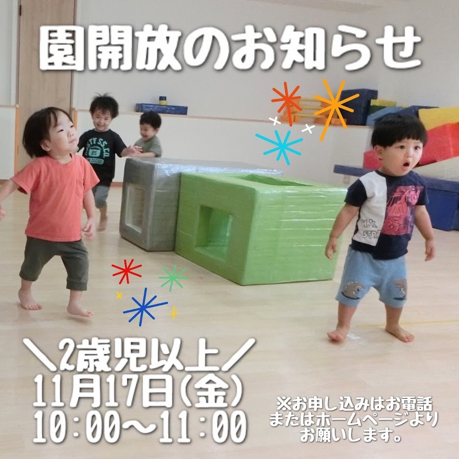 2023年10月10日(火) お知らせ 11月/園開放のお知らせ(2歳児以上) 在園児と一緒に広いスタジオで遊具を使った 遊びやリズム体操を行います。 ぜひご参加ください。 見学や入園相談も随時受け付けております ので、お気軽にお問い合わせください。 ◆園開放日 0歳児・1歳児 11月16日(木) 10:00~10:45 2歳児以上 11月17日(金) 10:00~11:00