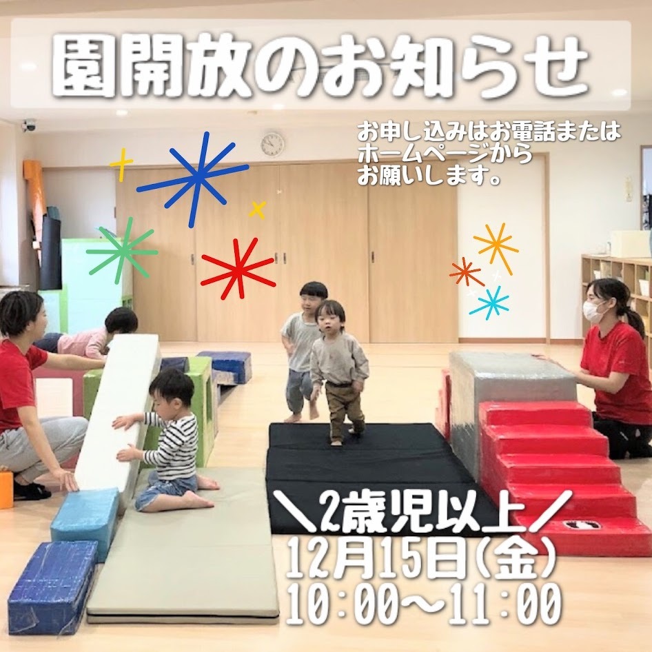 2023年11月22日(水) お知らせ 12月/園開放のお知らせ(2歳児以上) 在園児と一緒に広いスタジオで遊具を使った 遊びやリズム体操を行います。 ぜひご参加ください。 見学や入園相談も随時受け付けております ので、お気軽にお問い合わせください。 ◆園開放日 0歳児・1歳児 12月14日(木) 10:00~10:45 2歳児以上 12月15日(金) 10:00~11:00