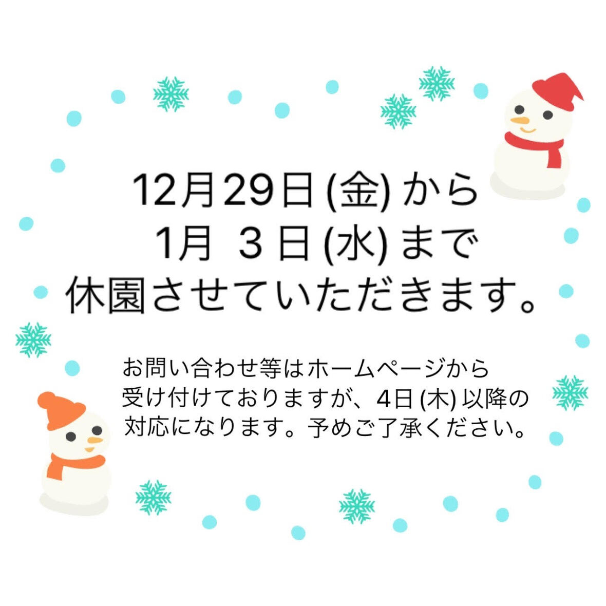 2023年12月28日(木) お知らせ 年末年始休園のお知らせ 12月29日(金)から1月3日(水)まで休園させて いただきます。 お問い合わせ等はホームページから受け付けて おりますが、4日(木)以降の対応になります。 予めご了承ください。 本年もありがとうございました(^o^) 良いお年をお迎えください☆彡