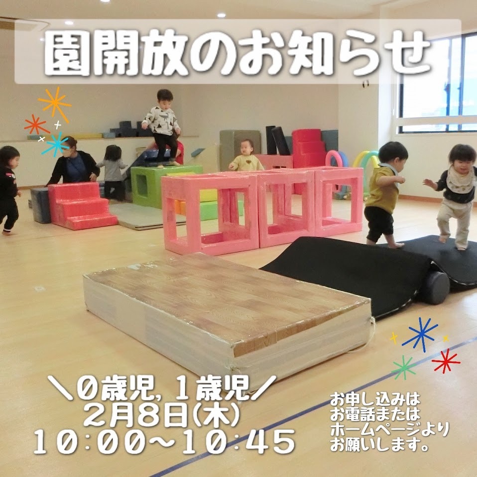 2024年01月24日(水) お知らせ 2月/園開放のお知らせ(0歳児、1歳児) 在園児と一緒に広いスタジオで遊具を使った 遊びやリズム体操を行います。 ぜひご参加ください。 見学や入園相談も随時受け付けております ので、お気軽にお問い合わせください。 ◆園開放日 0歳児・1歳児 2月8日(木) 10:00~10:45 2歳児以上 2月9日(金) 10:00~11:00