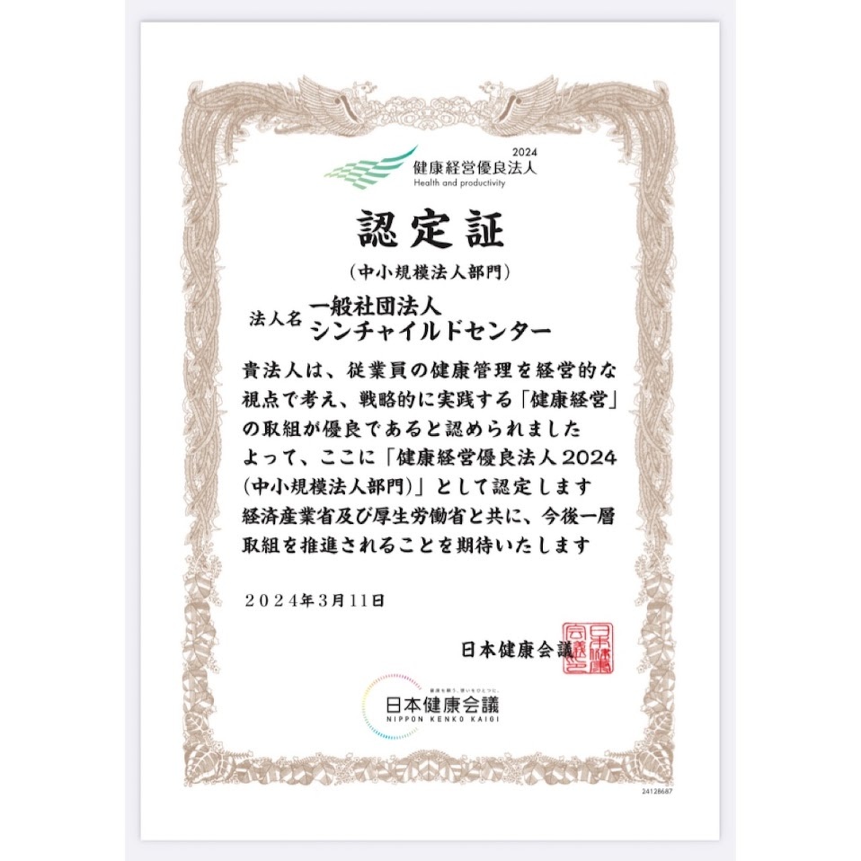 2024年03月13日(水) お知らせ 健康経営優良法人2024(中小規模法人部門)に認定されました! この度、健康経営優良法人2024(中小規模法人部門)に認定されました! おうち保育ももの家では月に2回、健康づくり教室を実施しています(^o^)