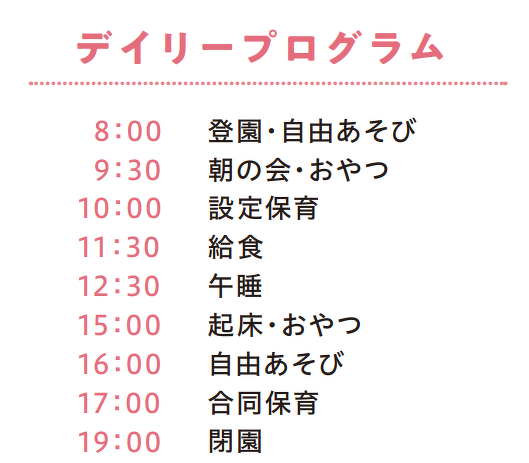 | 対象児童 | 0歳児(5か月)〜5歳児(定員19名) | |