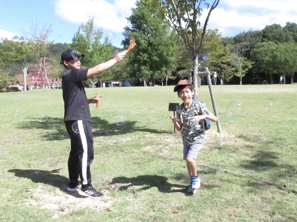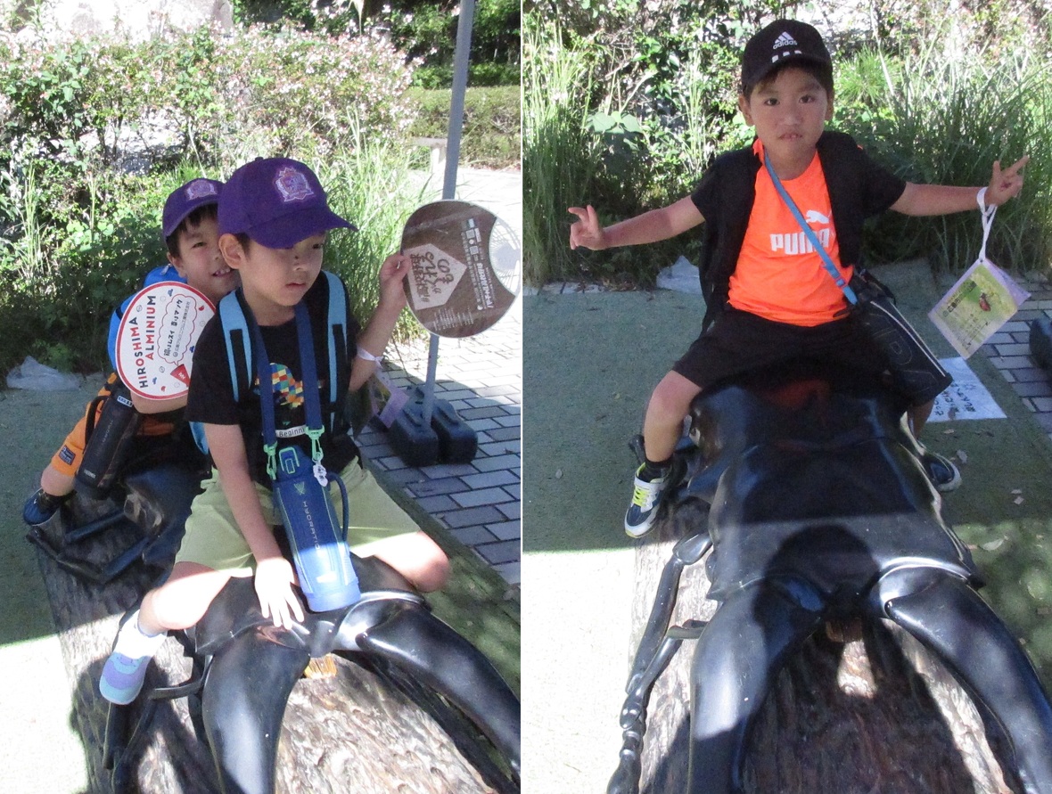 2024年09月23日(月) スタッフブログ 森林公園に行ってきました! 今日はみんなが楽しみにしている「お出かけプログラム」の日!今回は広島市森林公園に行ってきました。当初は台風を心配していましたが、予報よりも早く通過したことで最高にいい天気!広い野原を駆け回り、昆虫にも(オブジェだけでなく本物も)会うことができ、楽しい一日になりました。 森林公園に到着!広~い 野原でシャボン玉!笑顔で楽しそう オオクワガタ(オブジェ)にまたがってポーズ!! 中学生もアオムシとたわむれ・・・ もちろん、昆虫のお勉強もしました しっかり観察! 観光地あるあるの「顔出しパネル」もパチリ!