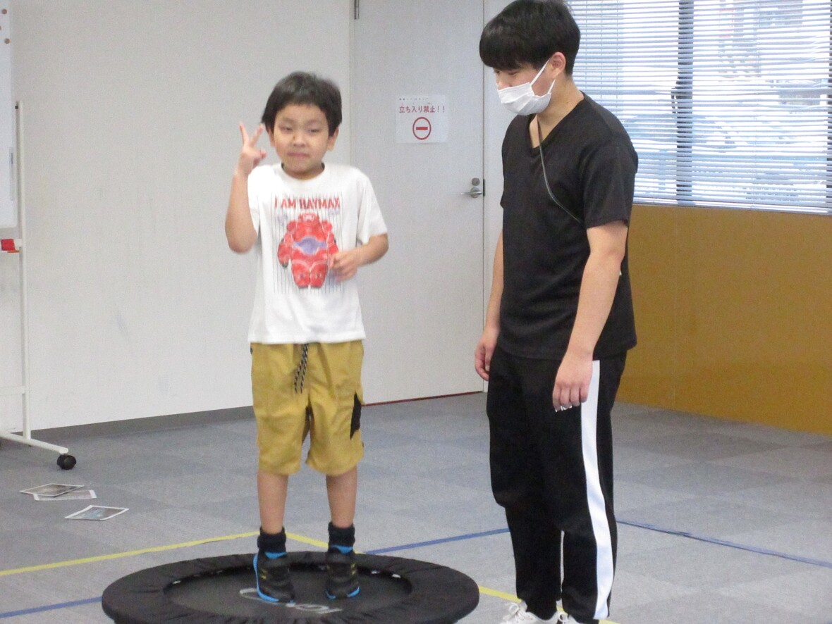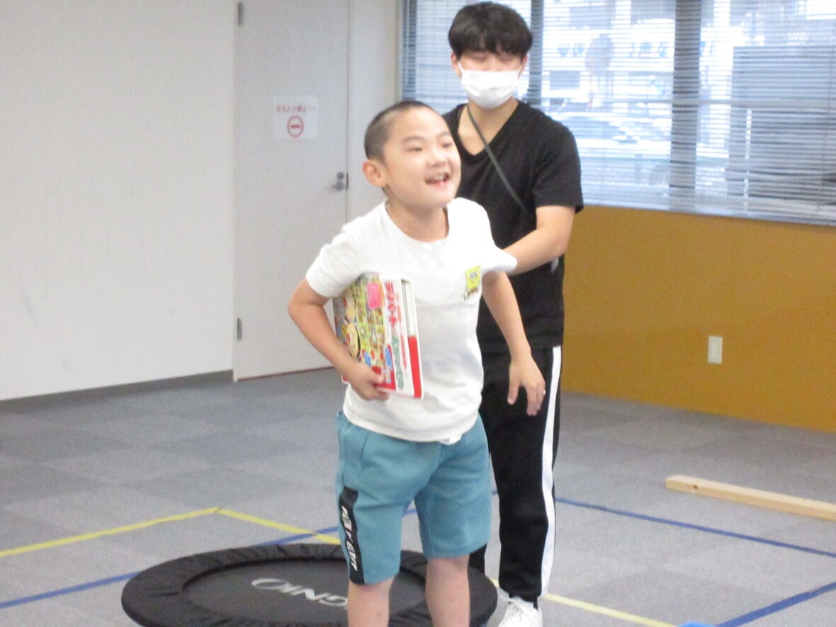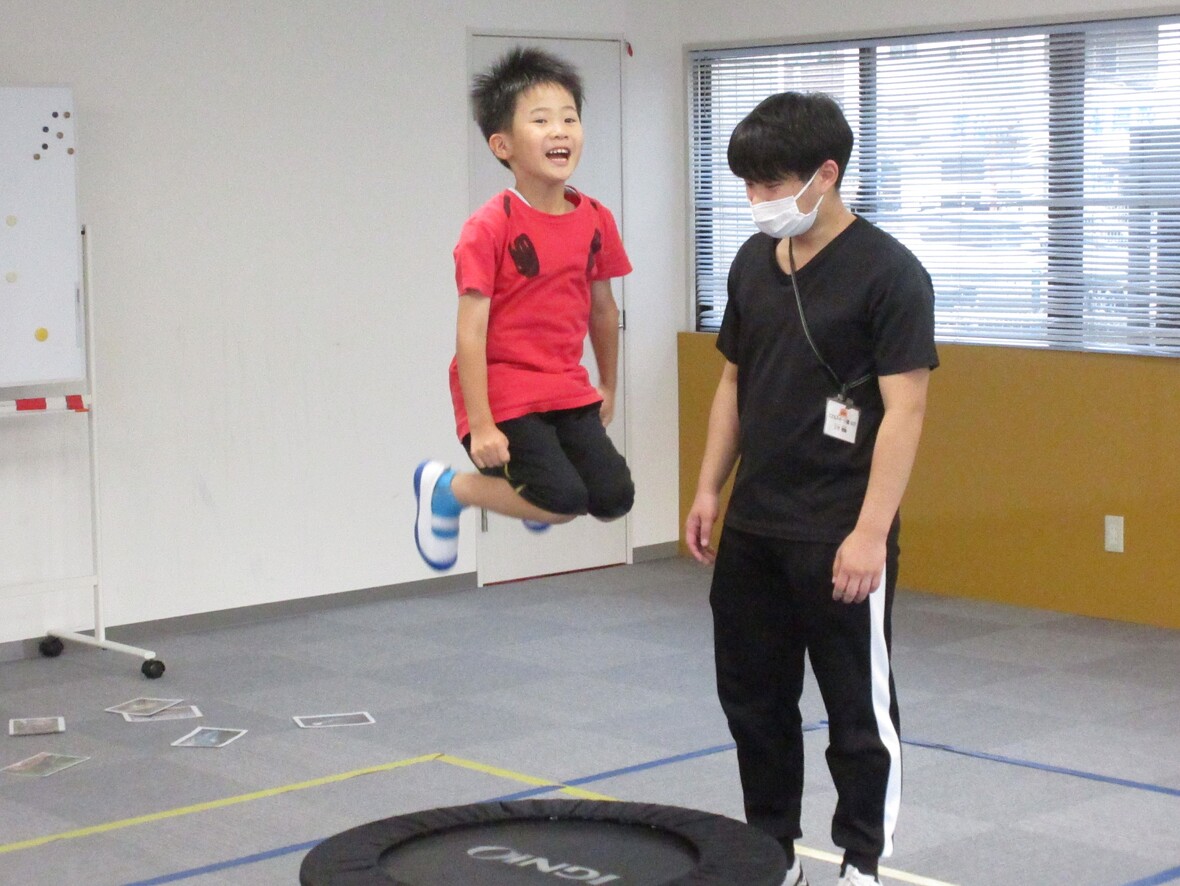 2024年09月30日(月) スタッフブログ 学習カードプログラムでトランポリンも始めました! 学習カードプログラムでは、いろいろな運動と組み合わせて、カードを使ったお勉強を楽しんでいます!今回は、いつものサーキット運動に加えて、トランポリンにもチャレンジ!!ピョンピョン跳ねるのは楽しいですね! いつもの一本橋を使ったバランス運動だけでなく・・・ トランポリンも行いました!とてもいい姿勢でジャンプできてますね! (^^)vサイン? トランポリン大好き!