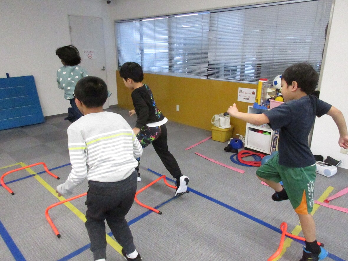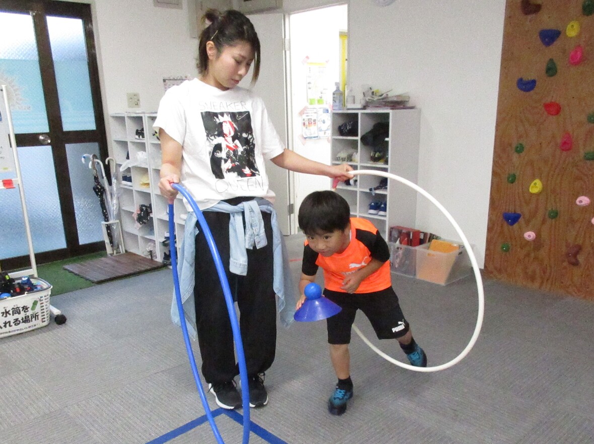 今日はナツミ先生のダンスプログラム!毎回ダンス前に、いろいろなアイテムを使用して、体力トレーニングを行います。まずミニハードルは、敏捷性やリズム感を養うトレーニング!多くのアスリートが取り入れているプログラムです。次にフープくぐりは、ボールをのせたミニコーンを手に持ち、ボールが落ちないようにバランスをとりながら、フープに触れずに移動していくトレーニングです。その際には、視覚情報と位置感覚(目で見ていなくても、関節の位置や動きの力、方向を感じる感覚)をフル回転させてフープをよけ、下半身をサスペンションのようにしなやかに使うことが必要です。どちらもダンスだけでなく、あらゆるスポーツ、そして日常生活にも必要な能力ですね。