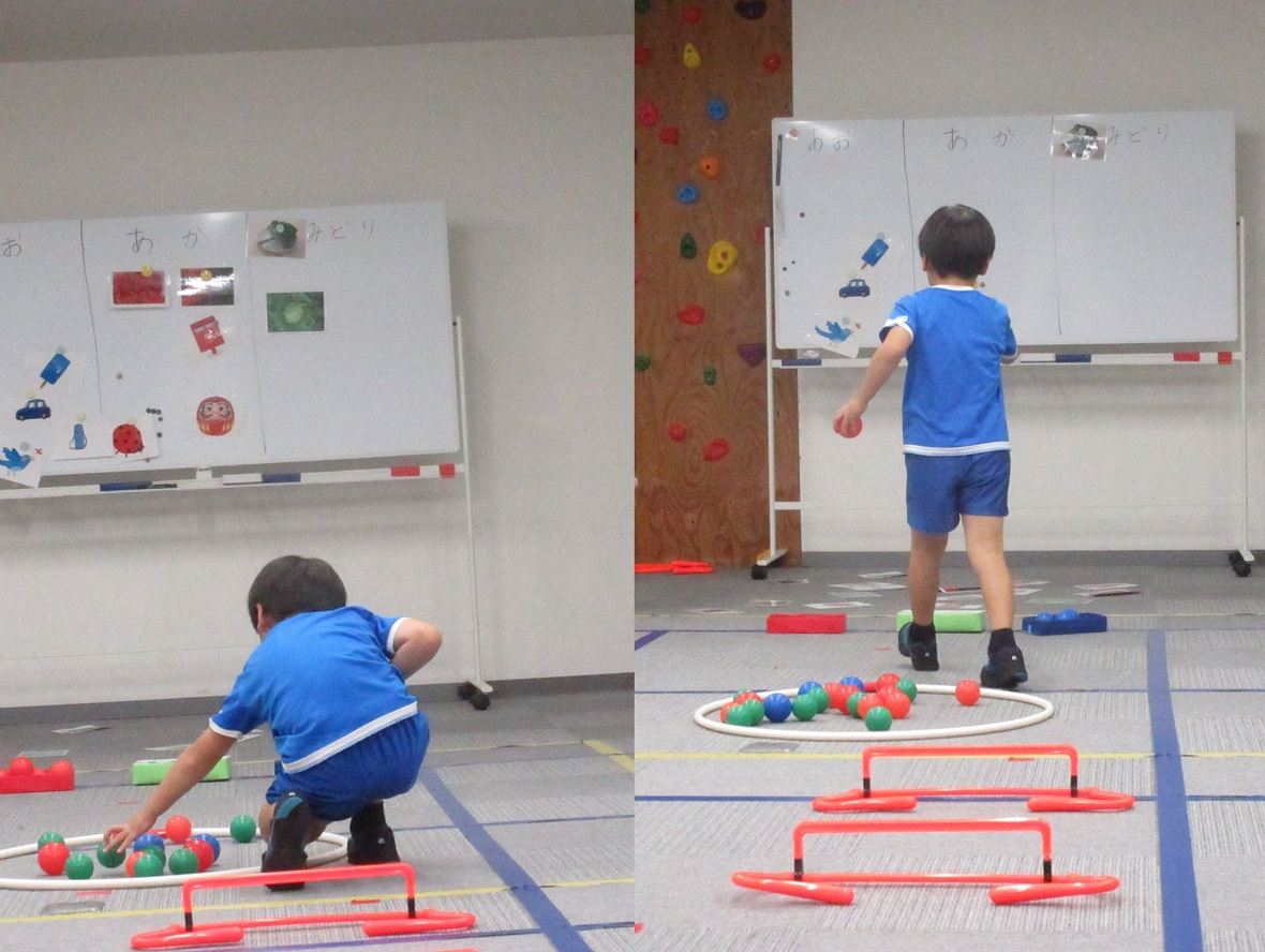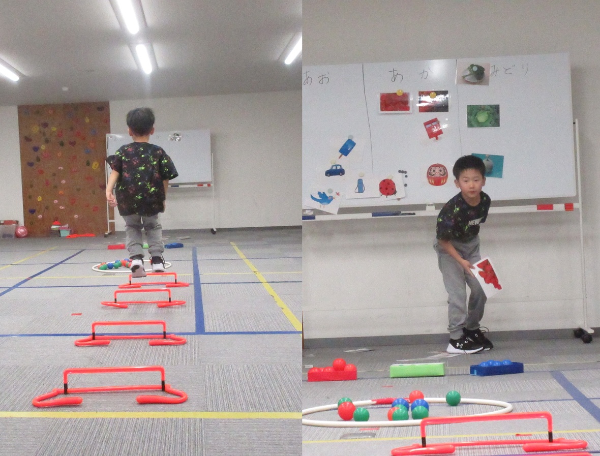 2024年11月25日(月) スタッフブログ 学習カードプログラムでしっかり体を動かしながらお勉強! 「しっかり体を動かすこと」と「お勉強」は両立しない?なんてことはありません。まずは集中できること、そして体を動かす筋肉の刺激と、学びの情報が結びつくことで効果が高まることも考えられます。今日も楽しくお勉強! カードをホワイトボードに貼って・・・ フープを使ってジャンプ! ボールをつかんで、次の課題へ 赤いボールを取ったら、赤い絵を探しましょう!