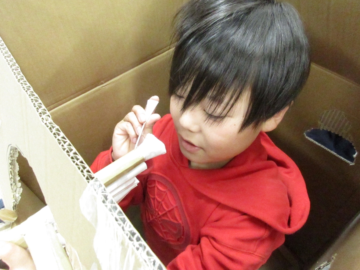 2024年12月11日(水) スタッフブログ 段ボールのロボット(秘密基地かな?)を作りました! 子どもたちは工作が大好き!荷物が届いた時など、使用済みの段ボールを使っていろいろなものを作っています!なかなかの完成度ですよ! ロボットの狭い入口から入ると・・・ 中はコックピットになっています!