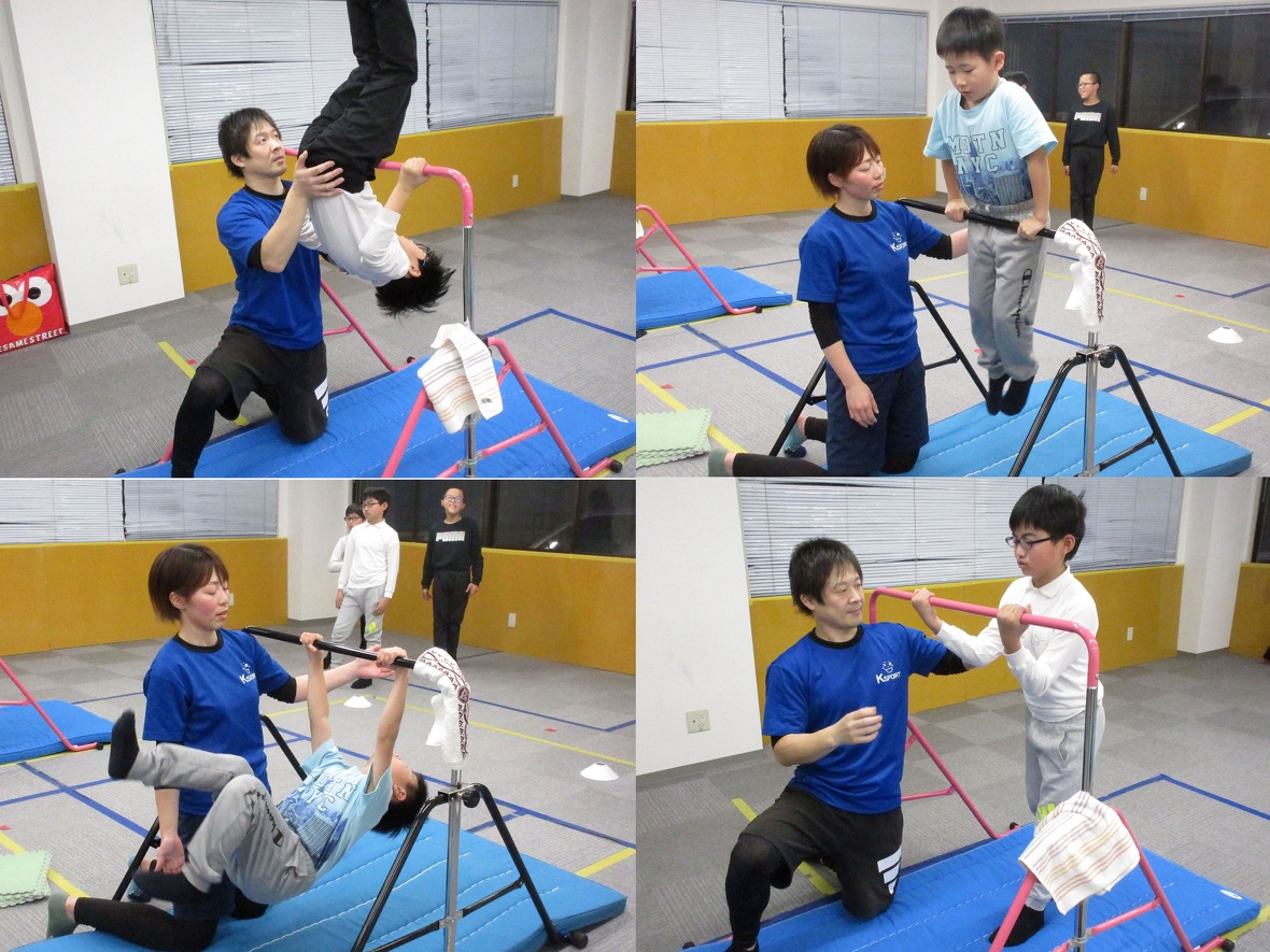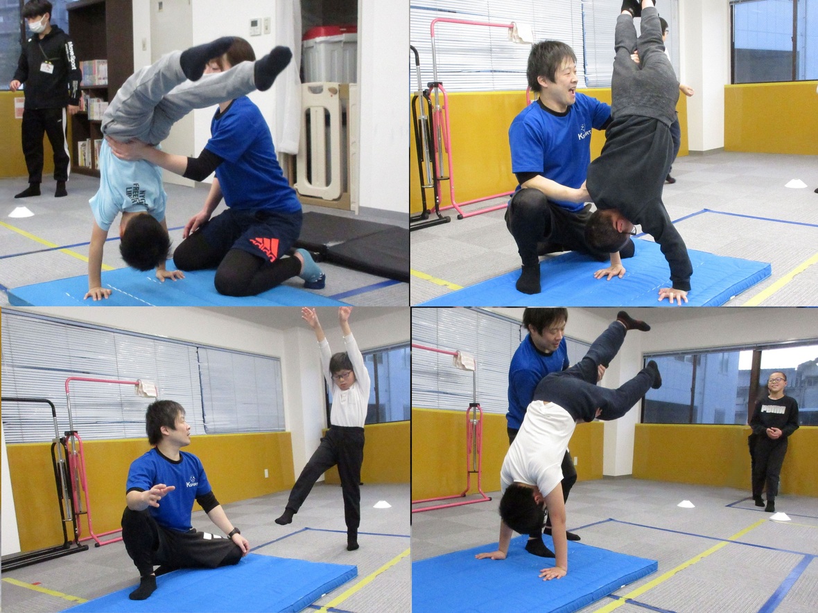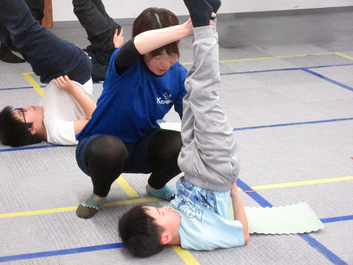 2025年01月24日(金) スタッフブログ 今日は体操の日! 今日はミポ先生とケイスケ先生の体操の日!マット運動は、肩倒立(肩と肘の3点で支える逆立ち)からはじめて、伸膝前転、倒立前転マットにチャレンジ!鉄棒では前回り(前回りおりとは違います)と逆あがりの練習に取り組みました! 肩倒立!しっかりと膝を伸ばしてバランスをとります! 膝を伸ばしたままの前転(伸膝前転)は柔軟性と腕で支える力が必要です。 倒立前転は、逆立ちを安定させてから、体をコンパクトにまとめて前転に移ります。 「前回り」は「前回りおり」とは違う、高度な技術です。スムーズな回転のために力を入れすぎてはいけません。