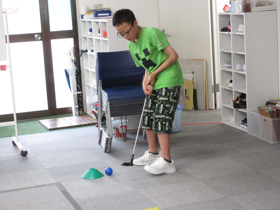 2025年09月04日(木) スタッフブログ 第1・第3火曜日は「パターゴルフ」の日 パターゴルフは、かめ先生・ナタリア先生が担当です! 最初は打つ練習をして、練習の後は、作ったコースを回って楽しみました!! ボールをよく見て! トンネルの中に入った?