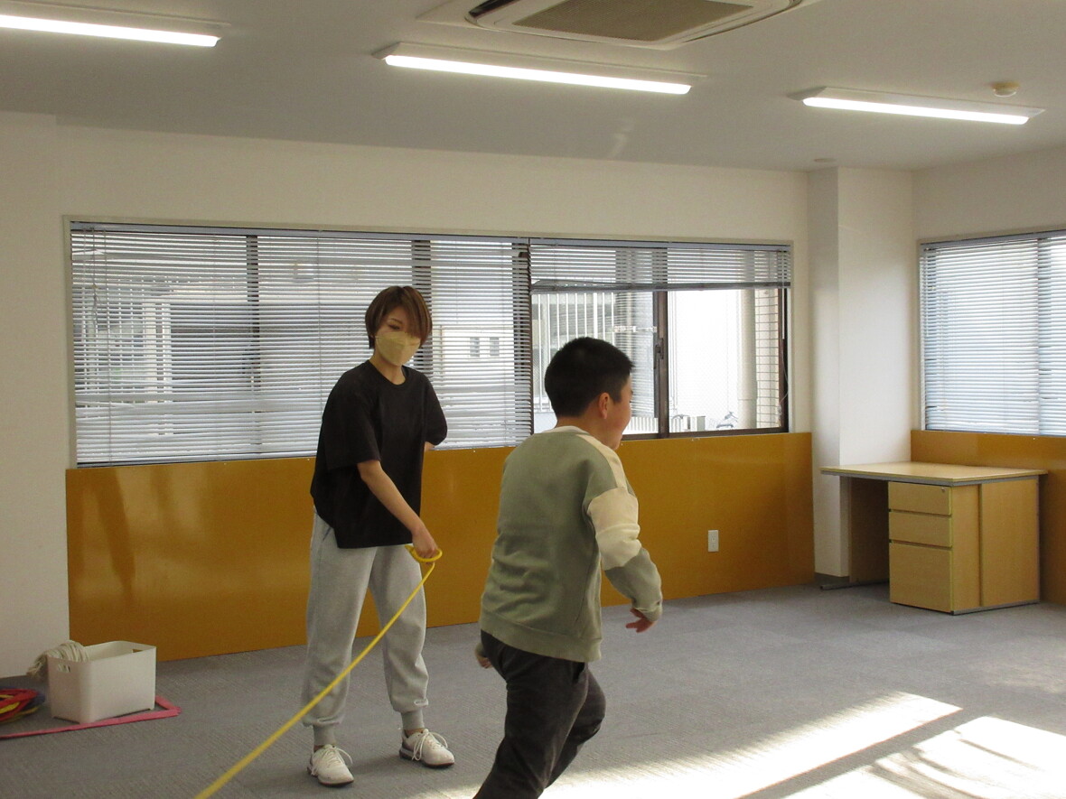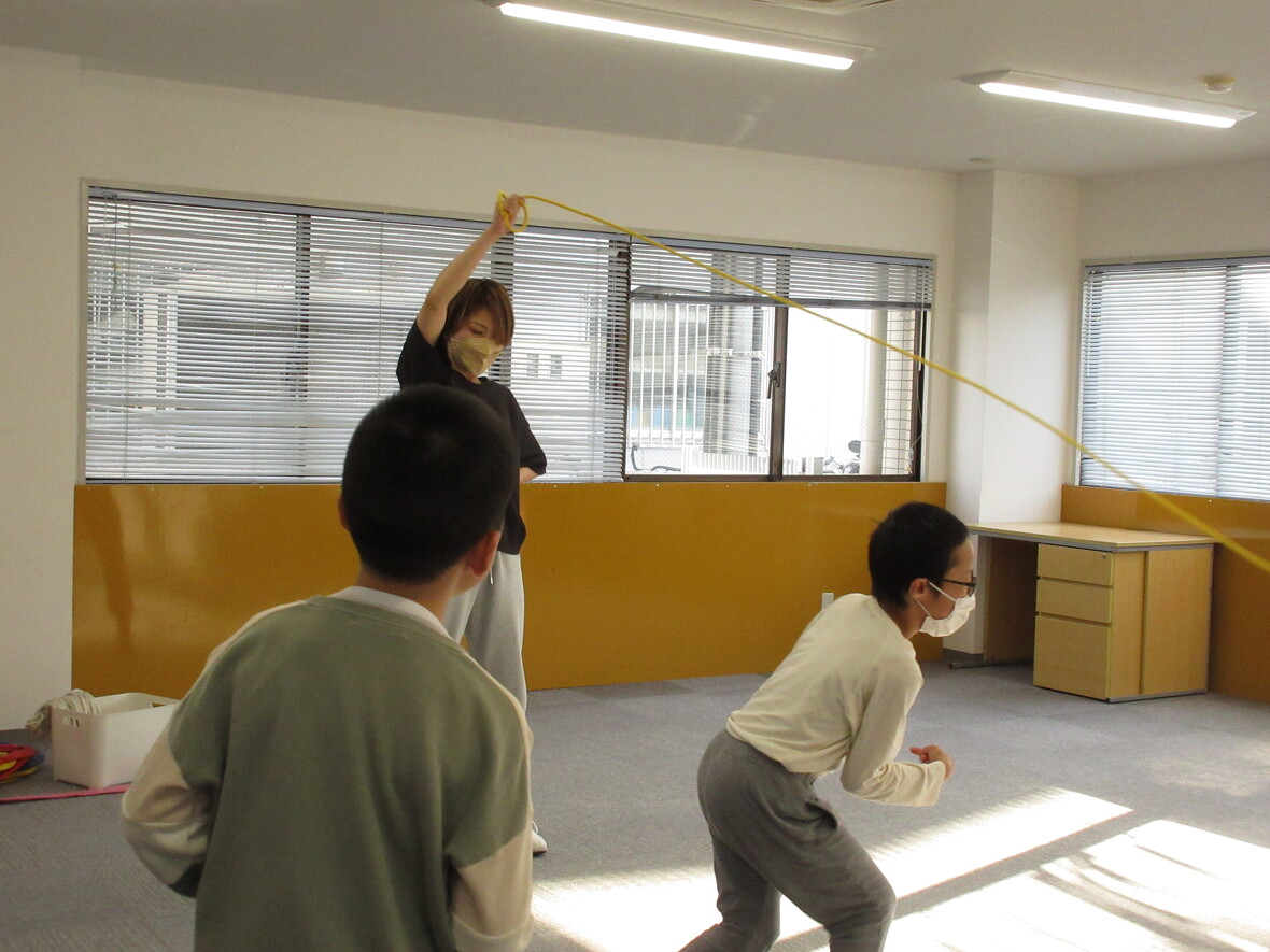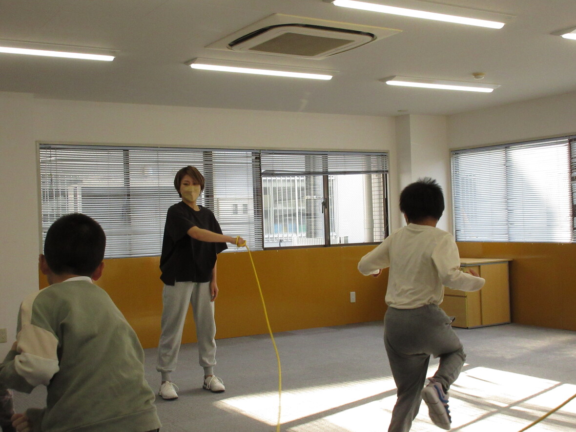 2023年05月01日(月) スタッフブログ フィットネス(なわとび) 今日のプログラムは「フィットネス(なわとび)」を行いました♬ 大繩を飛ぶのが初めてのお友達がいましたがお兄ちゃんお姉ちゃんがタイミングを合わせてそっと背中を押して縄をくぐることができ大喜び!指導員みんなも微笑ましく感じました☆
