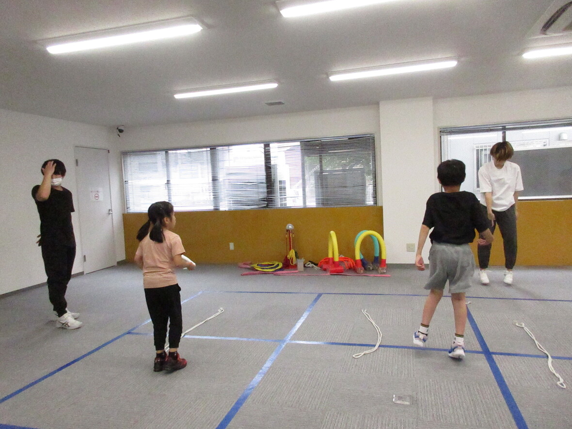 2023年07月19日(水) スタッフブログ フィットネス(なわとび) 今日のプログラムは「フィットネス(なわとび)」をしました! 始めはストレッチなどして輪っかやハードルなどで体を動かし後半では縄跳びを使って跳ぶ練習をして大縄跳びも最後みんなで跳んでみました! 大繩で順番に飛ぶときなかなか踏み込めないお友だちにそっと背中を押してタイミングを教えてあげてる姿が見られ微笑ましく感じました☆