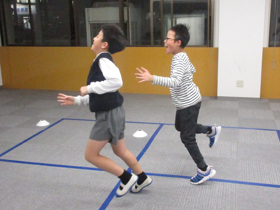 2023年11月28日(火) スタッフブログ おにごっこでコーディネーション おにごっこは、コーディネーション能力のうち、反応スピードと協応動作を高めるうえで必要な動きをたくさん行うことができます。何より楽しいのがいいですね!! じゃんけん~ポン! じゃんけんで負けたら追いかけます!! さあ頑張るぞ!! 逃げろ逃げろ・・・ よ~し!やるぞ