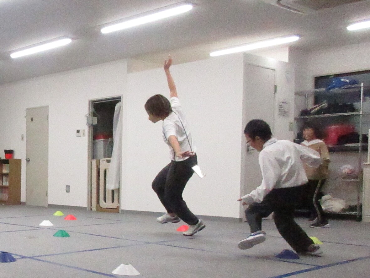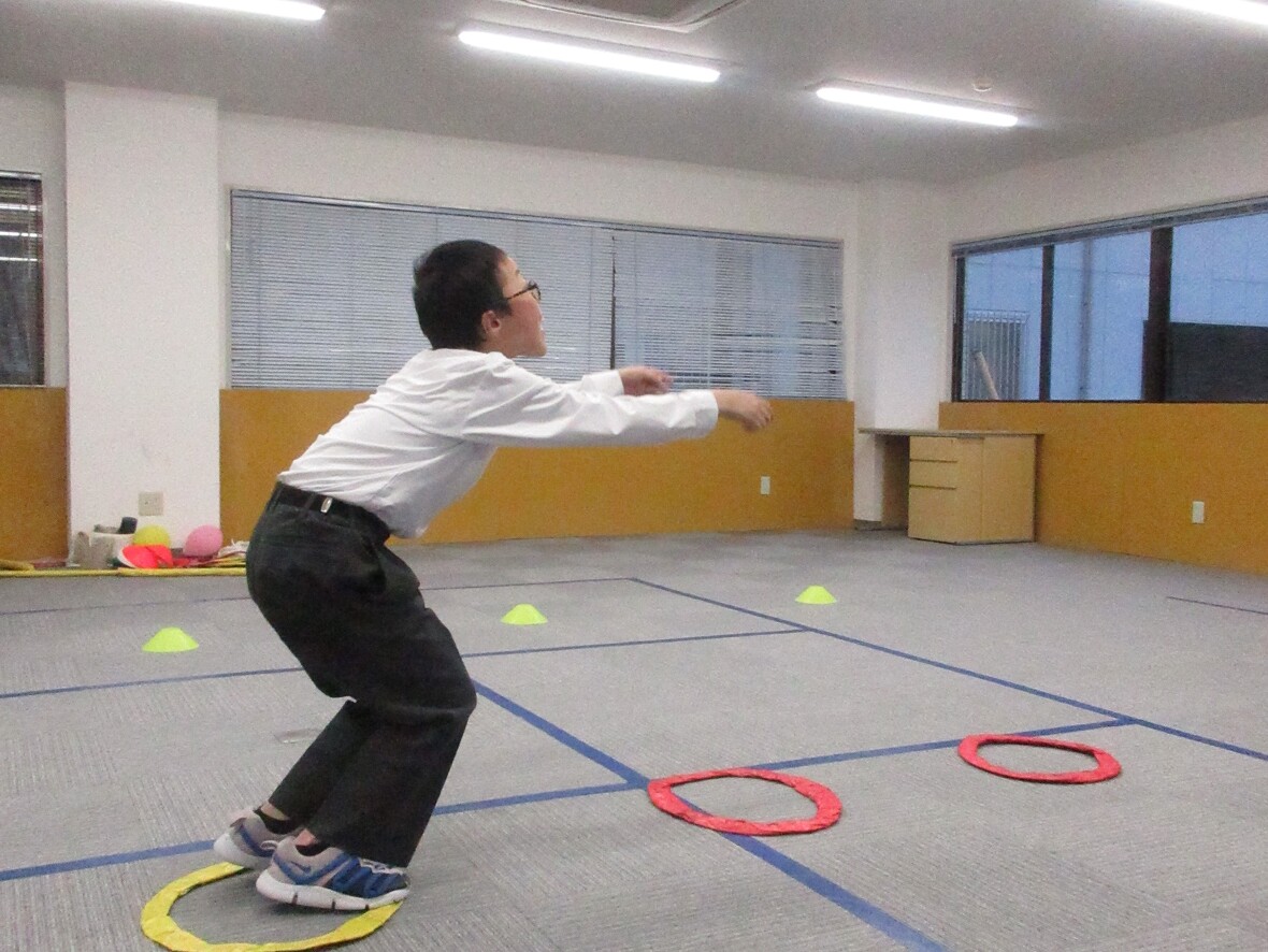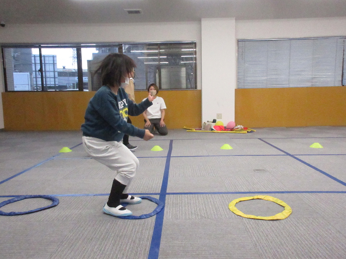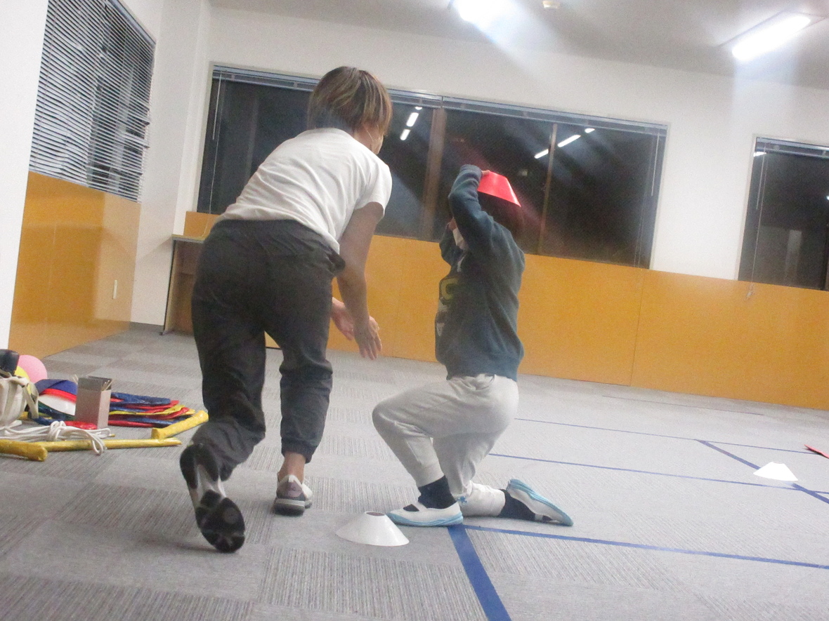 2023年11月30日(木) スタッフブログ ナツミ先生と”かけっこ&リレー”(フィットネスプログラム) フィットネスプログラムでは、子どもの体力向上を目的として、いろいろな運動を行っています。その中でも”かけっこ”は、多くのスポーツの基礎となる大切な全身運動です。また”リレー”はひとりひとりの体力に違いがあっても、チームワークでカバーできるので、楽しみながら行うことができますね!!みんなの笑顔がはじけていました。 準備運動のジャンプ!! 輪っかの色をよく見て身体を動かしてます! よく跳んでいます 狙いを定めて…… ジグザグ道のうえを歩いてみます さあ!チーム分け 先生も一生懸命 あ~抜かれる 頭に乗せたカラーコーンを落とさないようにゴールへ!