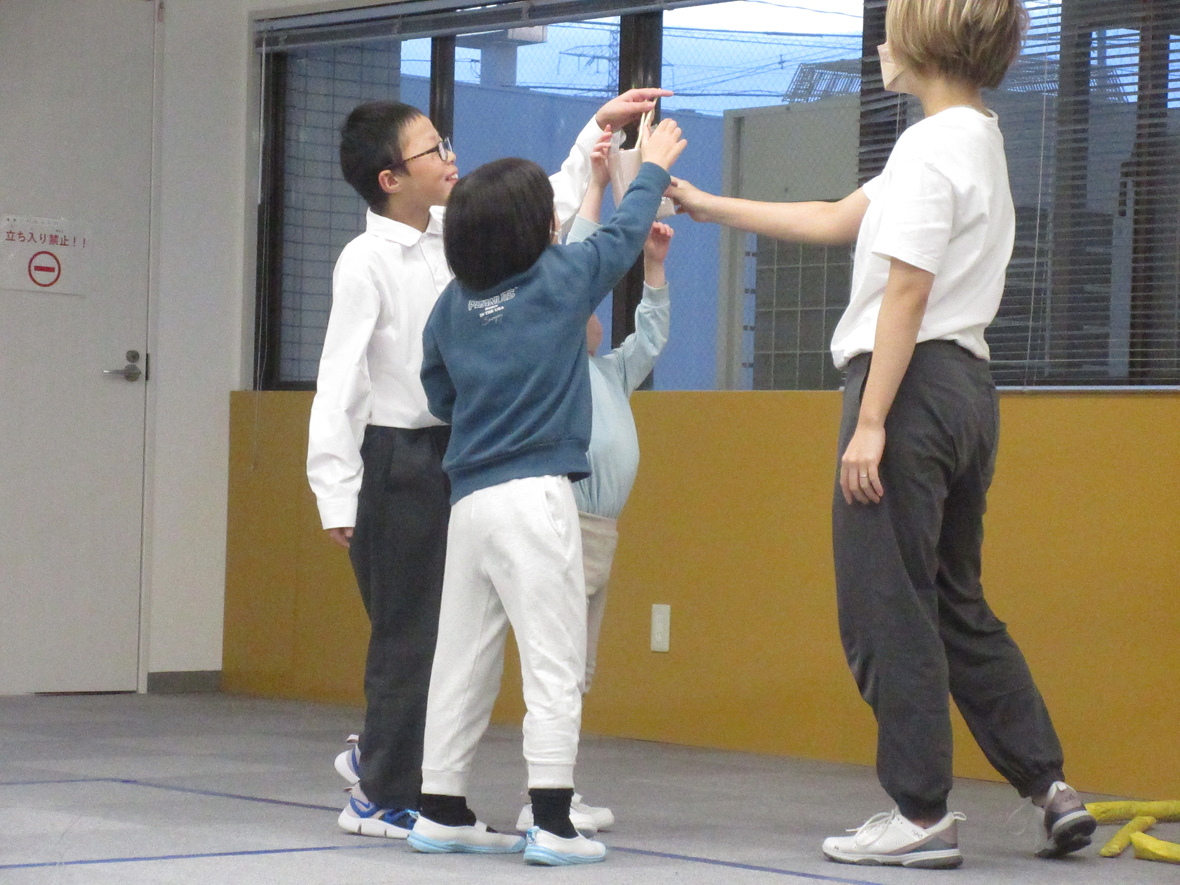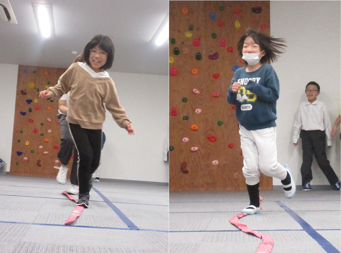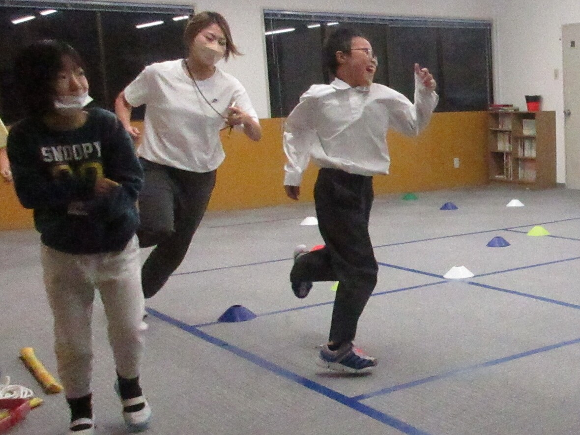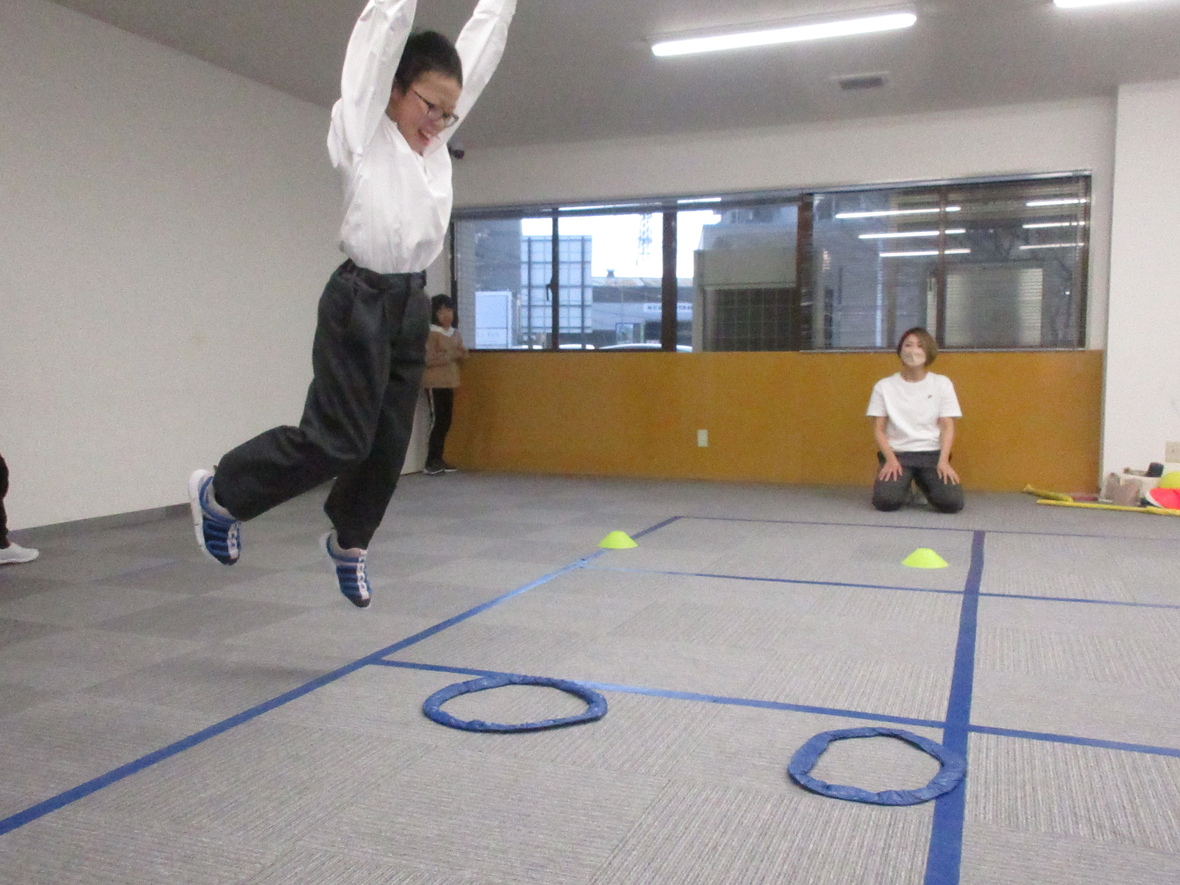 2023年11月30日(木) スタッフブログ ナツミ先生と”かけっこ&リレー”(フィットネスプログラム) フィットネスプログラムでは、子どもの体力向上を目的として、いろいろな運動を行っています。その中でも”かけっこ”は、多くのスポーツの基礎となる大切な全身運動です。また”リレー”はひとりひとりの体力に違いがあっても、チームワークでカバーできるので、楽しみながら行うことができますね!!みんなの笑顔がはじけていました。 準備運動のジャンプ!! 輪っかの色をよく見て身体を動かしてます! よく跳んでいます 狙いを定めて…… ジグザグ道のうえを歩いてみます さあ!チーム分け 先生も一生懸命 あ~抜かれる 頭に乗せたカラーコーンを落とさないようにゴールへ!